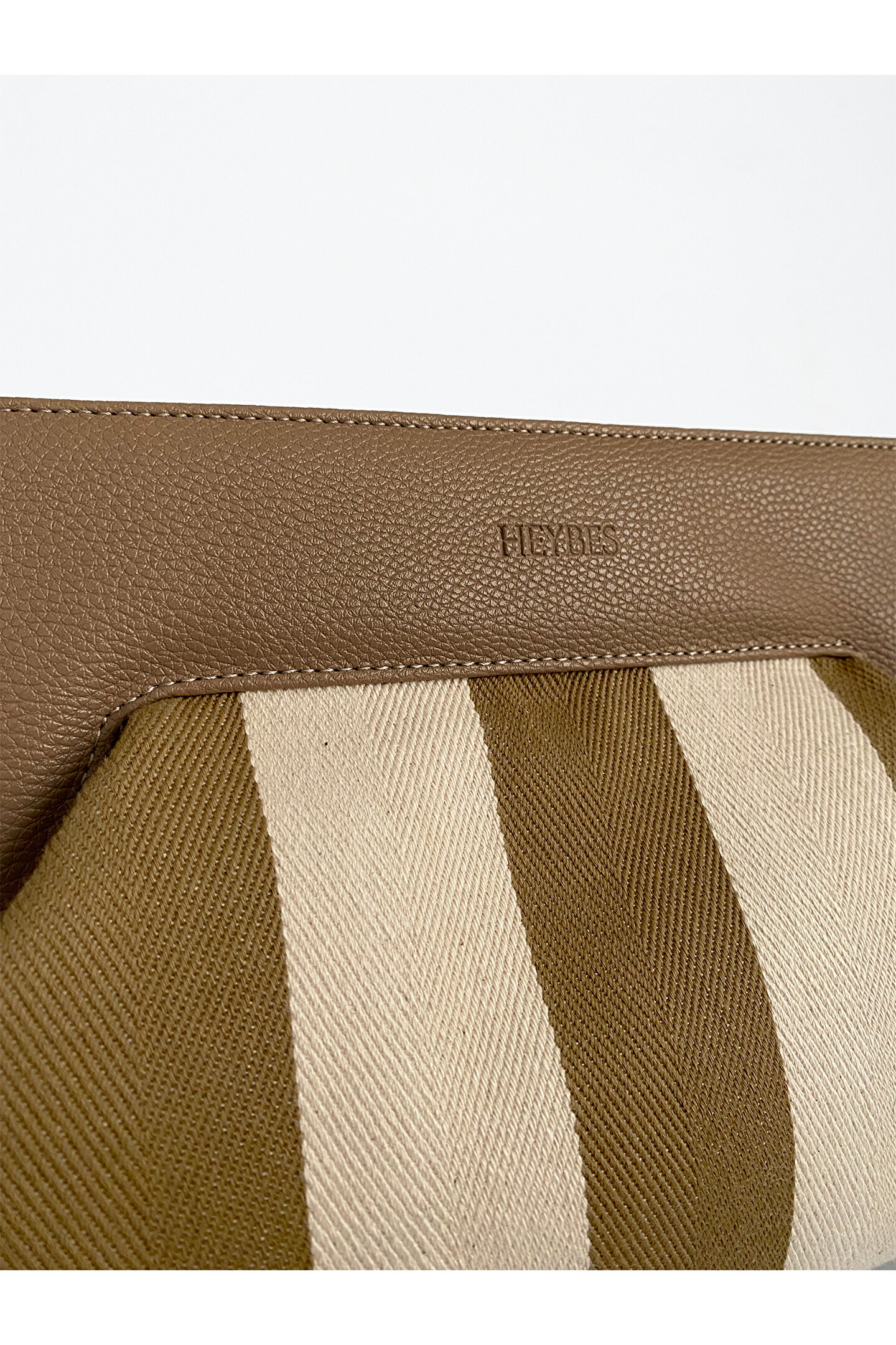 Heybes Kadın Vizon Çizgi Desenli Kanvas Clutch El Çantası; Tekstil materyalden üretilmiş olup, dayanıklılığı ve şık görünümü ile öne çıkar.; Vizon çizgi deseniyle modern ve trend bir stil sunar, günlük kullanımda dikkat çekici bir aksesuar oluşturur.; Dokuma kumaş tipi sayesinde hafif ve konforlu bir taşıma deneyimi sağlar.; Gündelik ortamlarda rahatlıkla tercih edilebilecek günlük kullanım için idealdir.; Vegan deri detayları ile hem dayanıklılığı hem de estetik görünümü bir arada sunar.; Mıknatıs kapak sistemi pratik kullanım imkânı sunar.; Heybes tarafından özel el işçiliği ile üretilmiştir.; ; İç kısmı astarlıdır ve 1 adet iç cebi bulunmaktadır.; •Gövde: Kanvas Dokuma Kumaş •Çerçeve: Vegan Deri •İç Materyal: Vegan Deri; 34x23x11 cm (Genişlik x Yükseklik x Derinlik) ölçülerindedir.; • İç hacim yükseklik: 16 cm • İç hacim genişlik: 18 cm