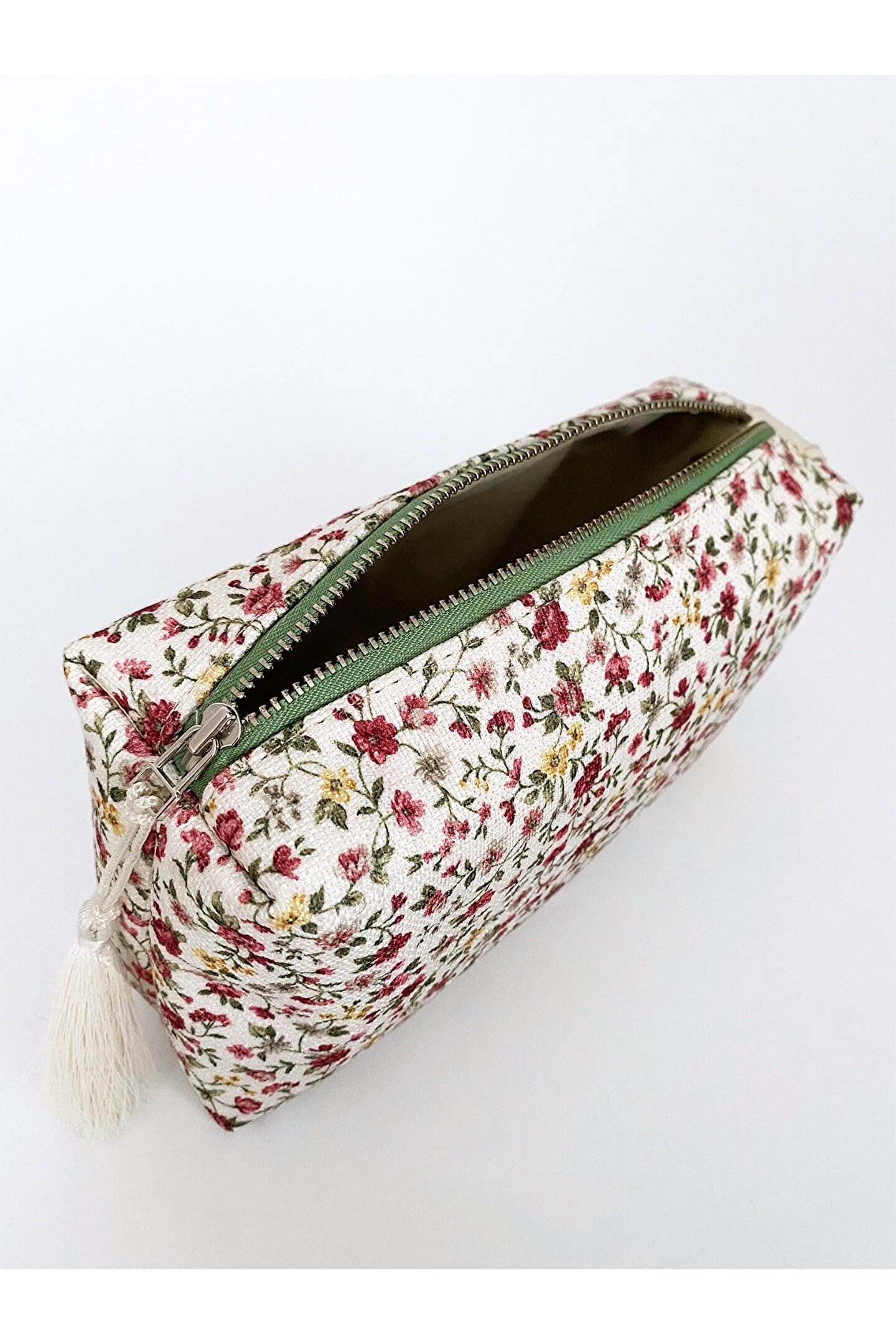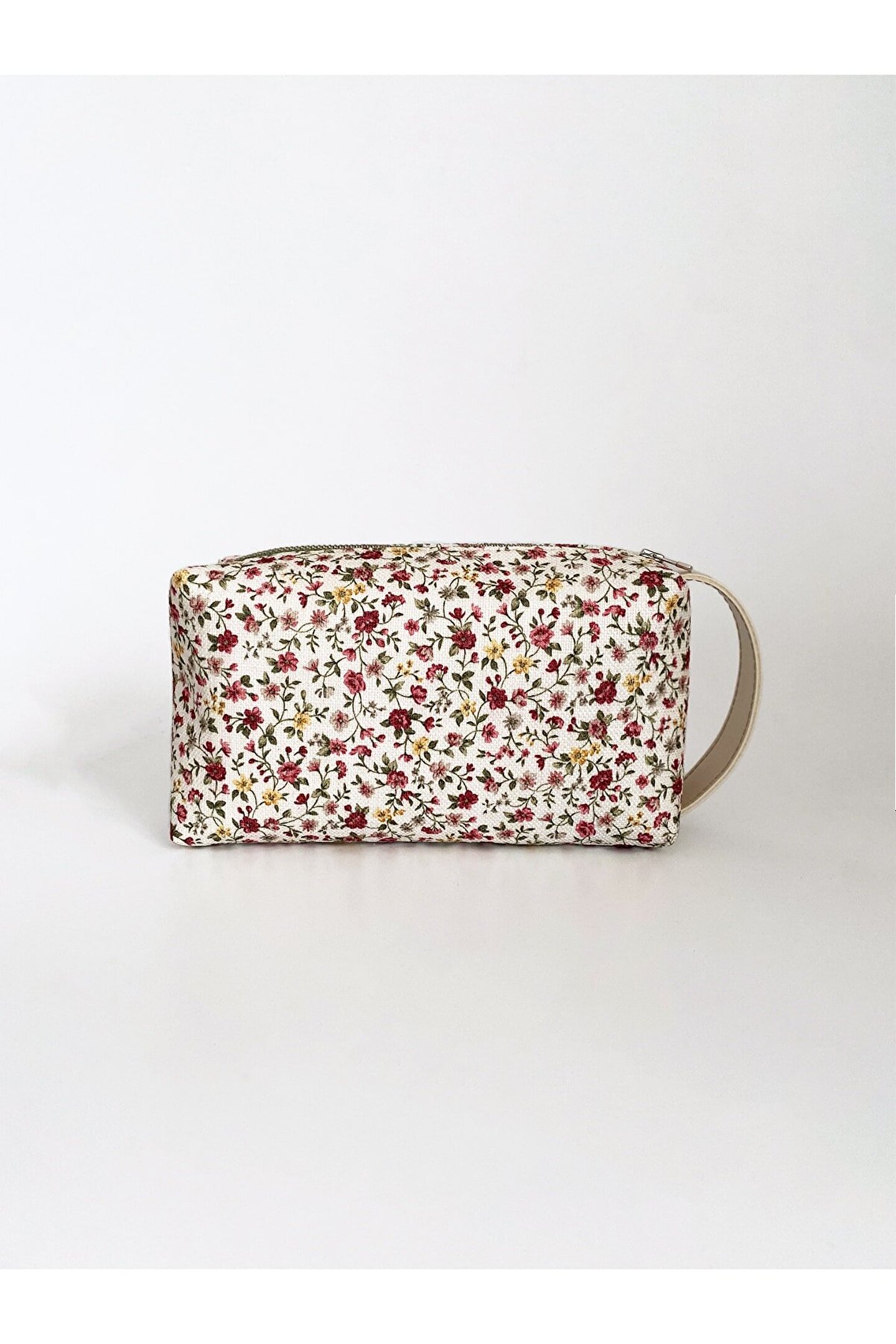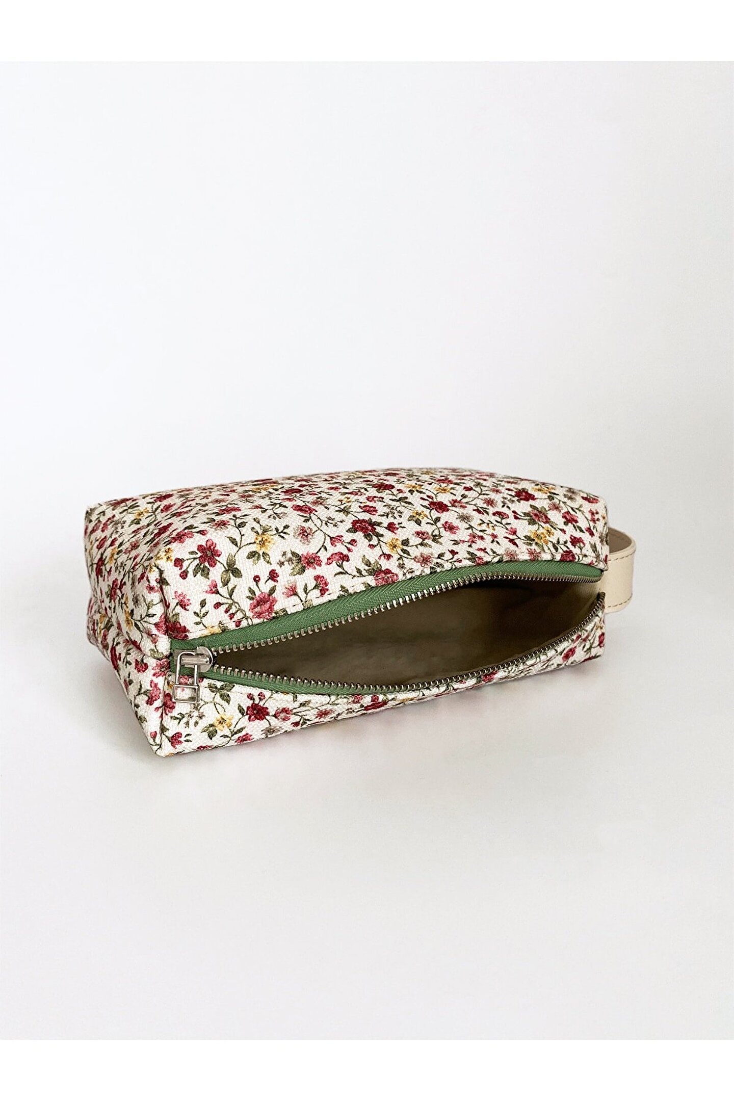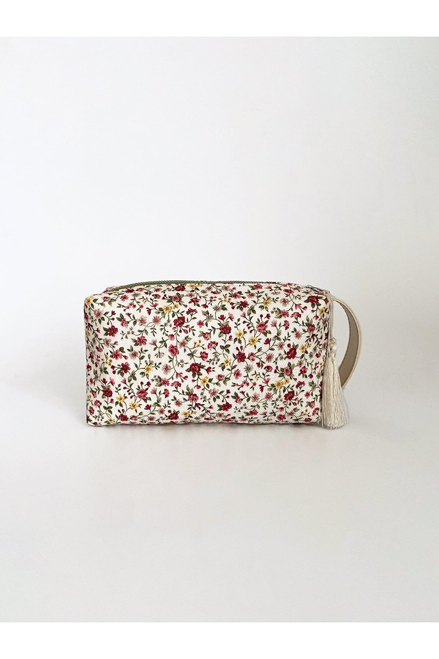 Kadın Çiçek Desenli Kulplu Makyaj ve El Çantası.; Ürünün yanındaki kulp sayesinde elde kolaylıkla taşıma sağlanır.; Renkli ve canlı tonlarıyla enerjik bir görünüm kazandırır, her kıyafetle uyum sağlar.; İç kısmı astarlıdır.; Püskül detayı çıkartılarak da kullanılabilir.; En x Boy x Derinlik: 22x12x8 cm'dir.; Vegan deri ve polyester karışımından üretilmiş olup, hem hayvan dostu hem de dayanıklıdır.; Kurutucu kullanılmaması ve çamaşır suyu/beyazlatıcı gibi kimyasallardan kaçınılması önerilir; böylece çantanızın renkleri ve deseni korunur.