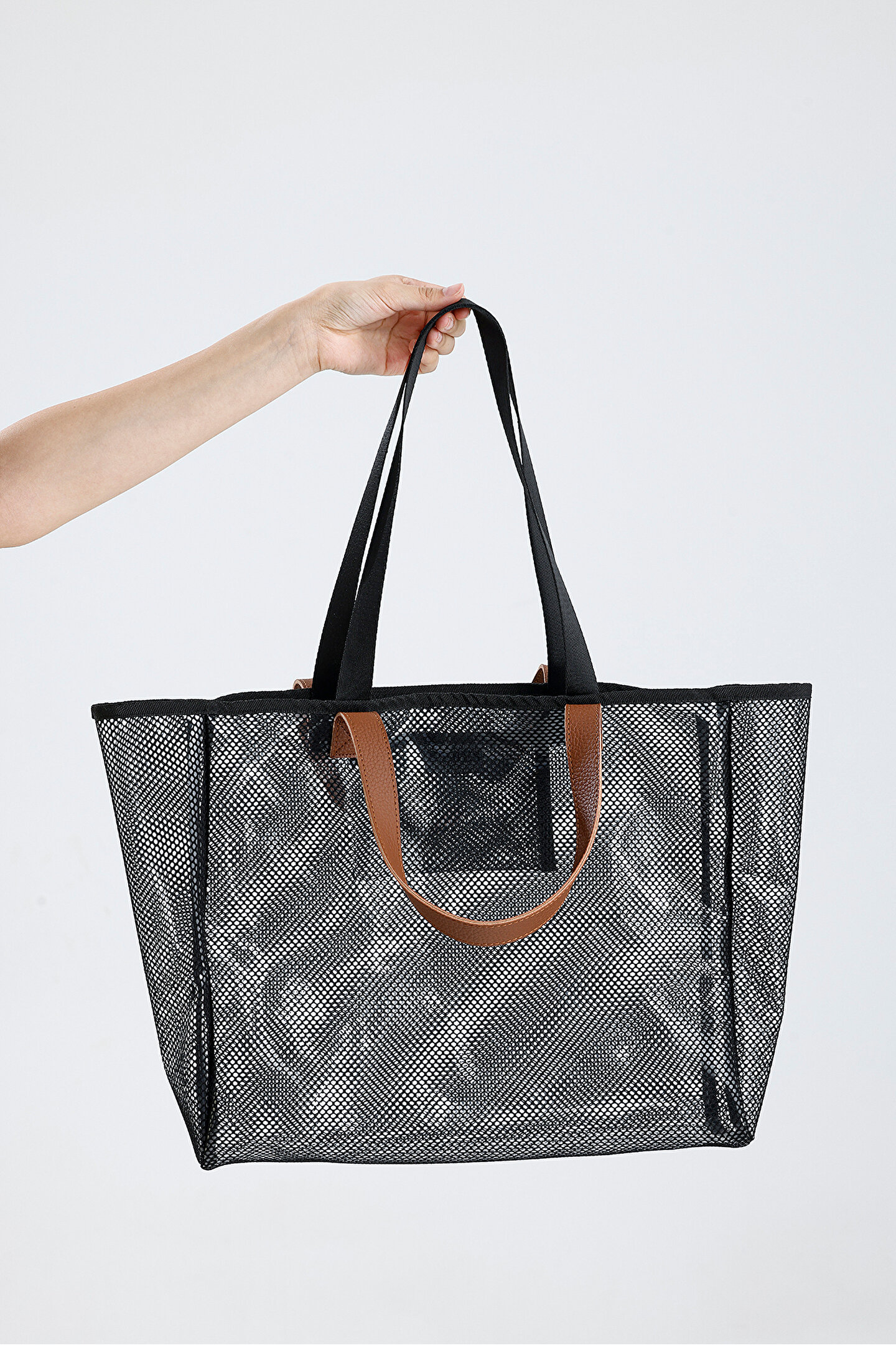 HEYBE‘S Kadın Siyah File Şeffaf Büyük Boy Plaj Ve Alışveriş Shopper Tote Omuz Çantası
