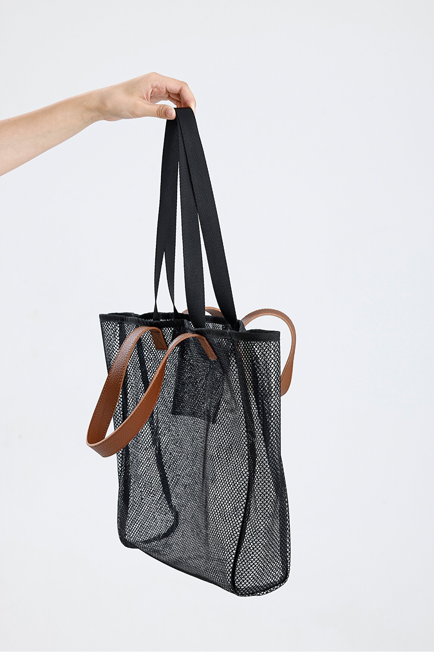Kadın Siyah File Şeffaf Büyük Boy Plaj ve Alışveriş Shopper Tote Omuz Çantası.; ; PVC malzeme üzerine siyah file kumaş kaplanmıştır bu sayede su geçirmezdir ve dayanıklıdır.; ; PVC malzeme ürünün temizliğinde kolaylık sağlamaktadır.; ; Plaj için ve günlük kullanıma uygundur.; ; Havlu, cüzdan, krem ve benzeri eşyalarınızı rahatlıkla taşıyabileceğiniz ölçülerdedir.; ; Plajda, havuzda, piknikte ve kampta dilediğiniz her yerde eşyalarınızı organize ederken sizlere de şık bir tasarım ile keyifli bir çanta eşlik edecektir.; 1 adet iç cebi bulunmaktadır.; Uzun ve kısa olmak üzere iki sapı bulunmaktadır bu sayede hem el çantası hem de omuz çantası olarak kullanabilirsiniz.; Kısa sap uzunluğu: 40 cm, uzun sap uzunluğu: 73 cm'dir.; 58x35x18 cm (Genişlik x Yükseklik x Derinlik) ölçülerindedir.