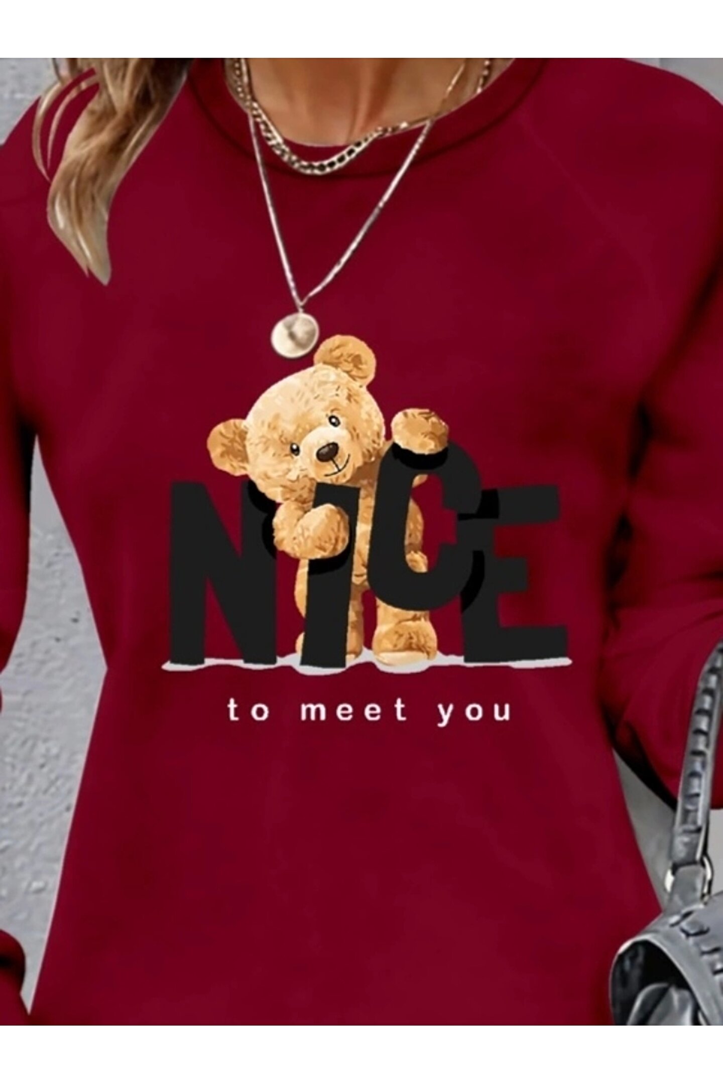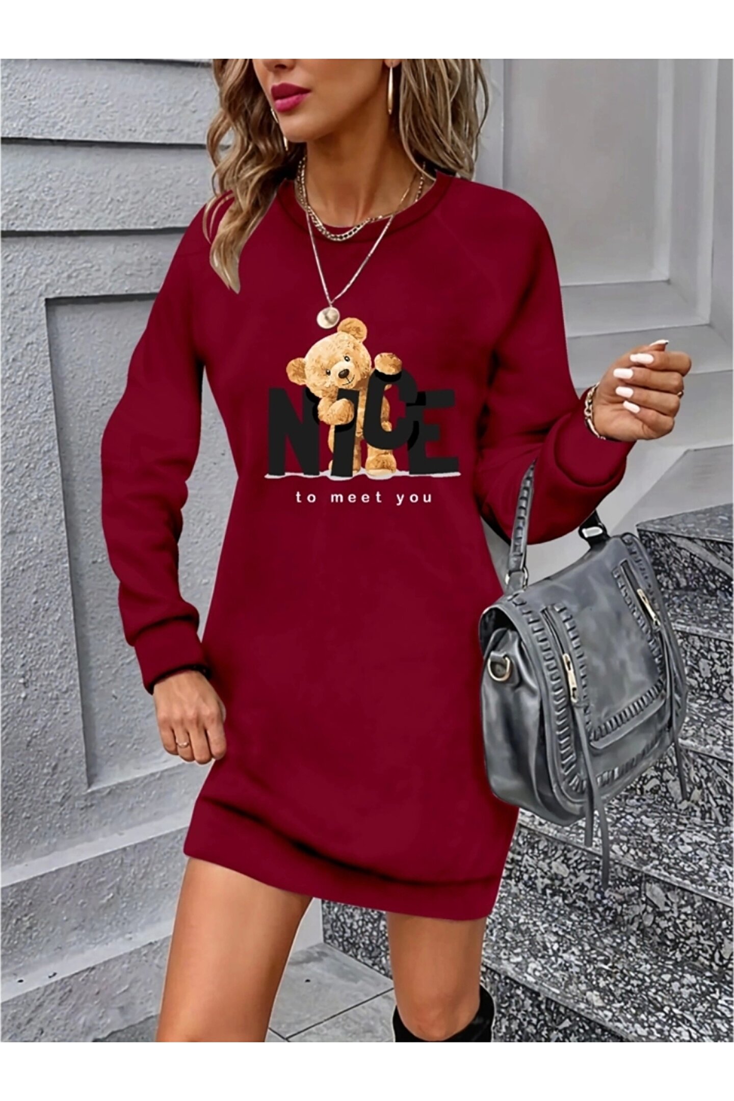 HobiDünyasıElif Kadın Uzun Kollu Bisiklet Yaka Ayı Desenli Viskon Iki Iplik Elbise