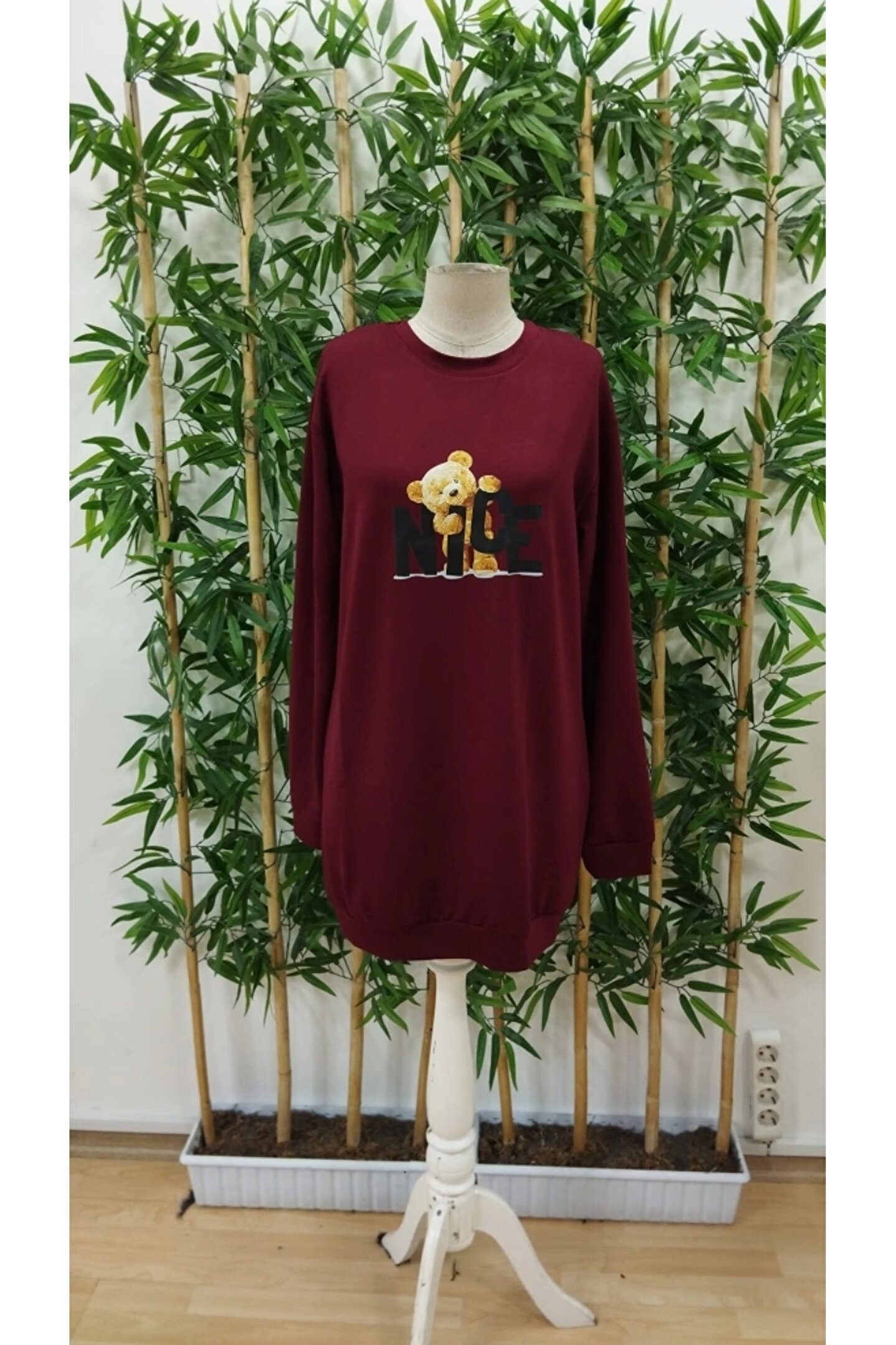HobiDünyasıElif Kadın Uzun Kollu Bisiklet Yaka Ayı Desenli Viskon Iki Iplik Elbise