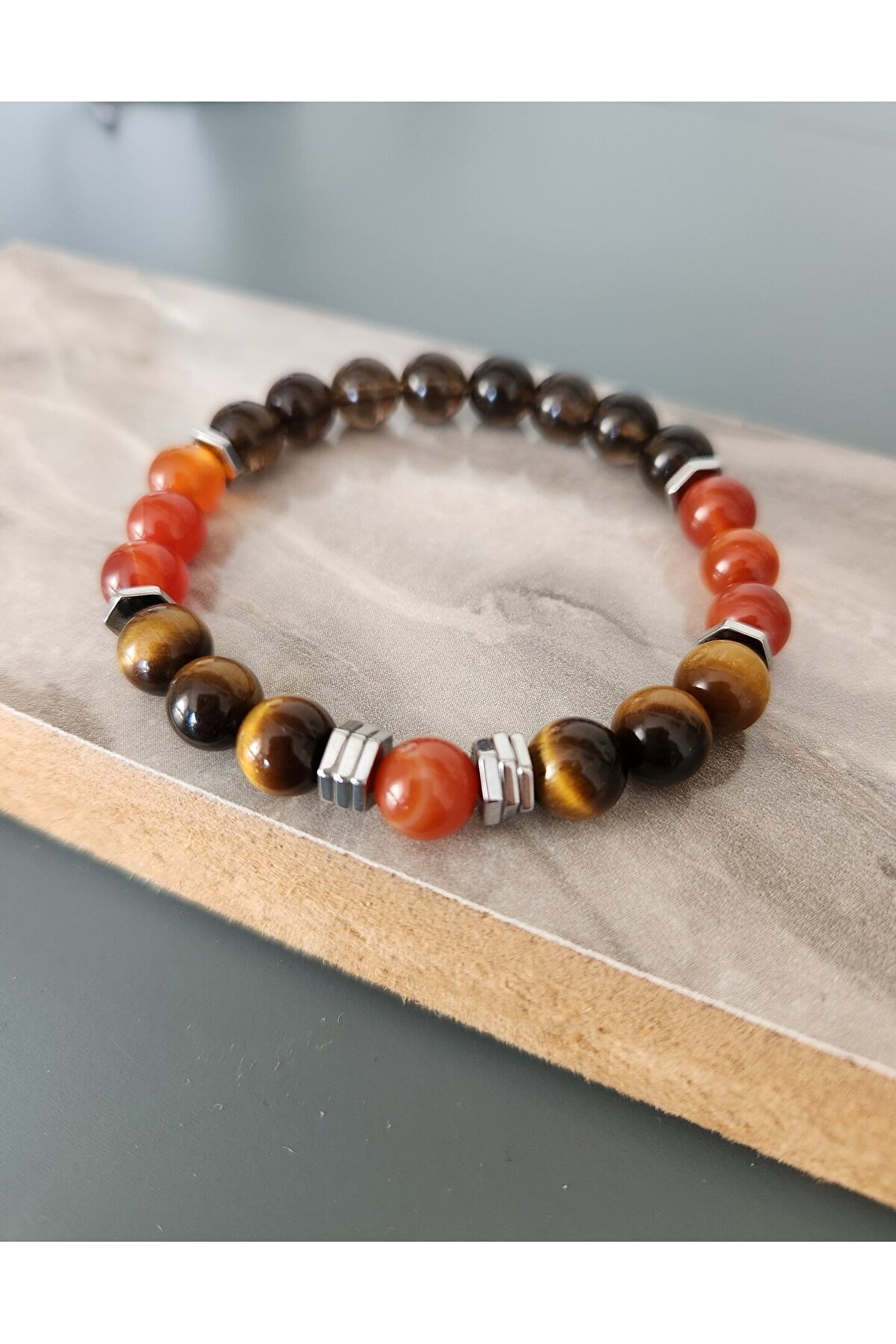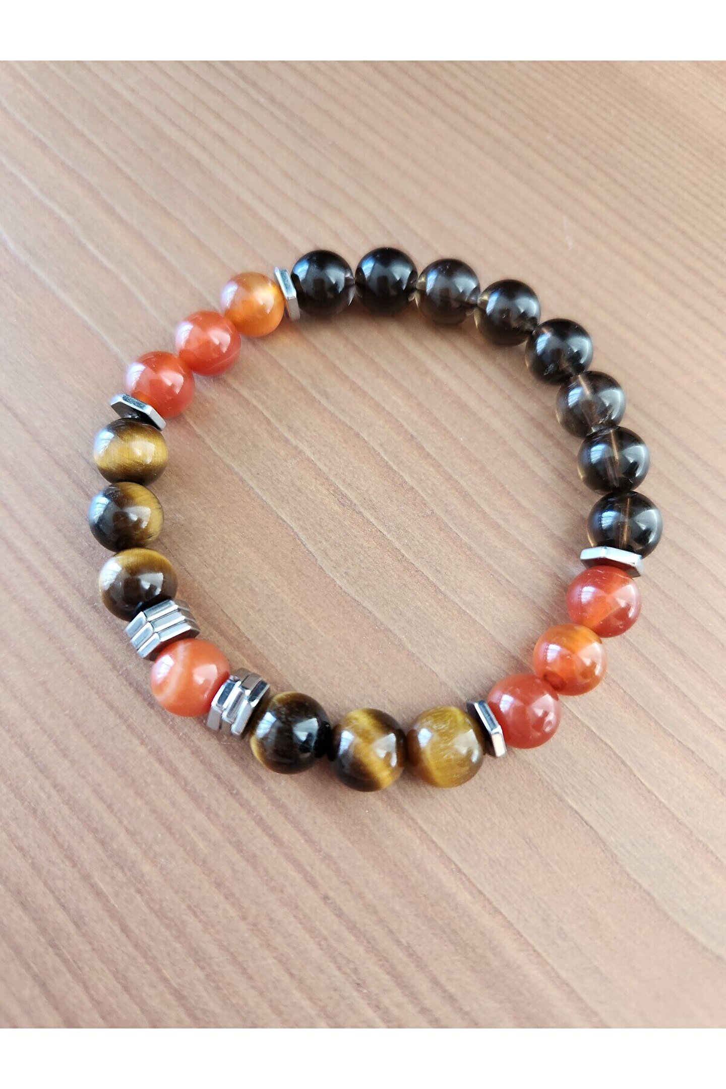 Doğal taş materyali ile üretilmiş, şıklığı ve doğallığı bir arada sunan bileklik; Akik, kaplangözü ve dumanlı kuvars gibi nadir bulunan taşların birleşimiyle benzersiz bir tasarım; Her bileklik, el yapımı olup, her bir parçanın kendine özgü desen ve renk tonlarına sahip olmasıyla dikkat çeker;