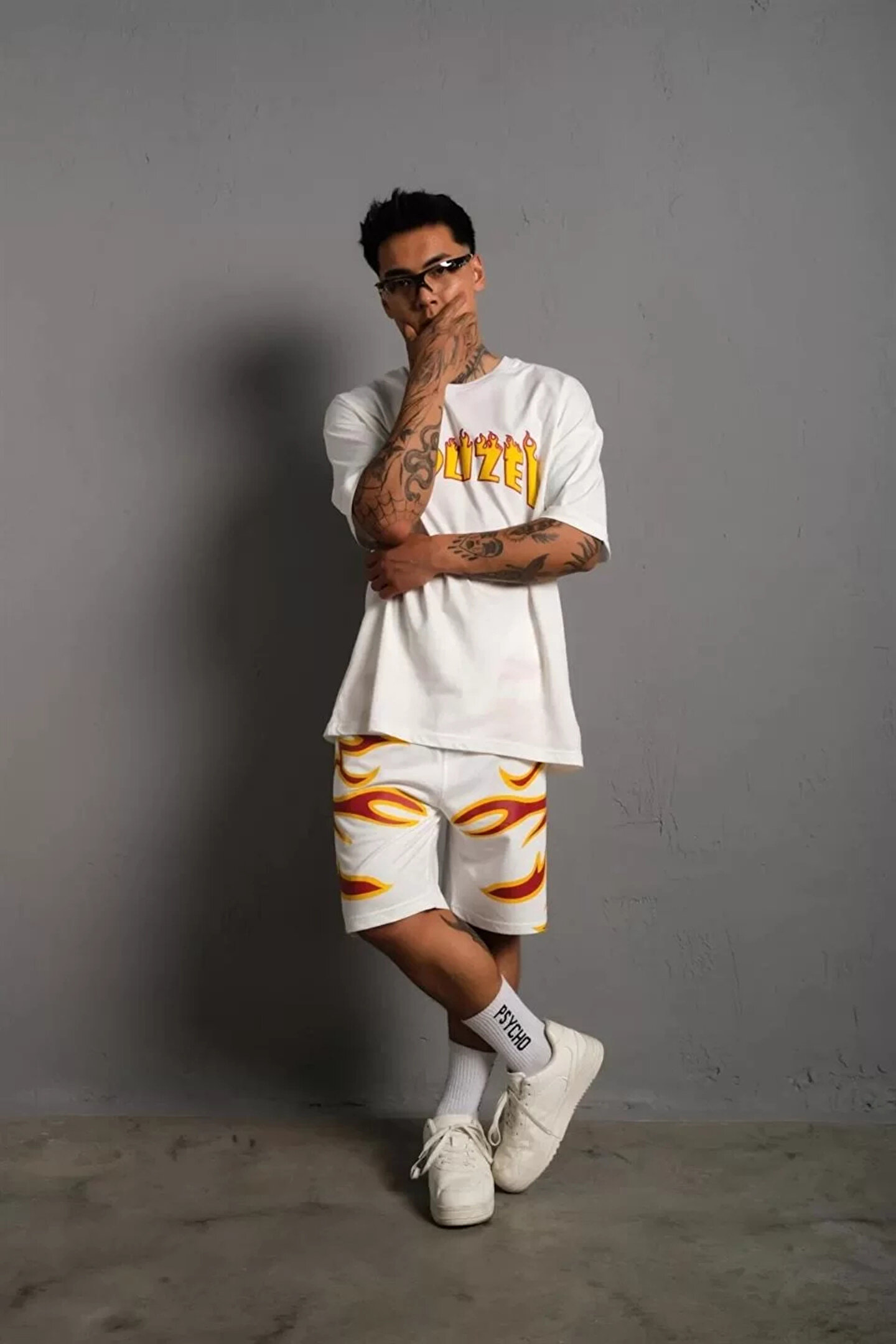 Hybridcolletting Erkek Alev Baskılı İkili Şortlu Takım - Beyaz