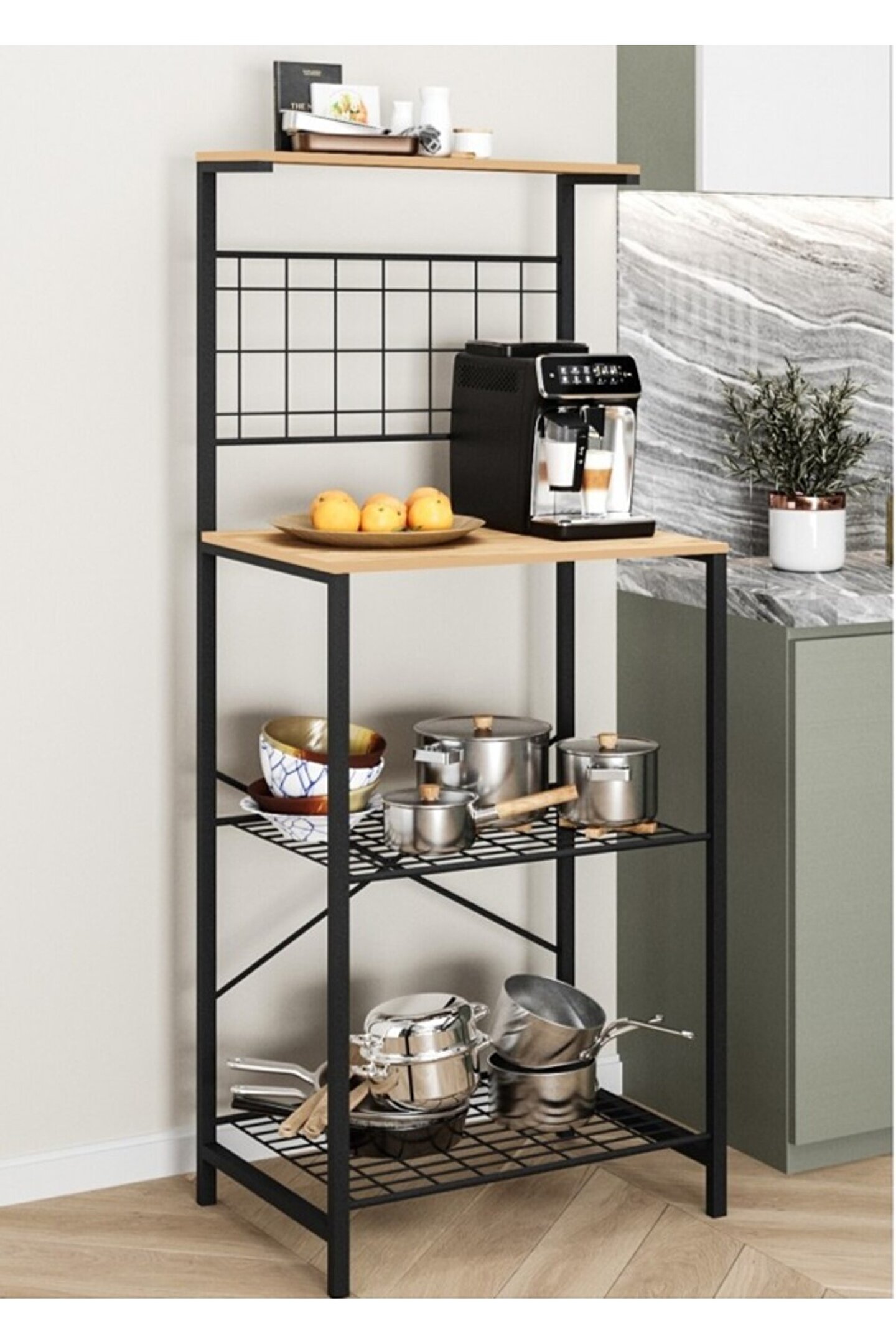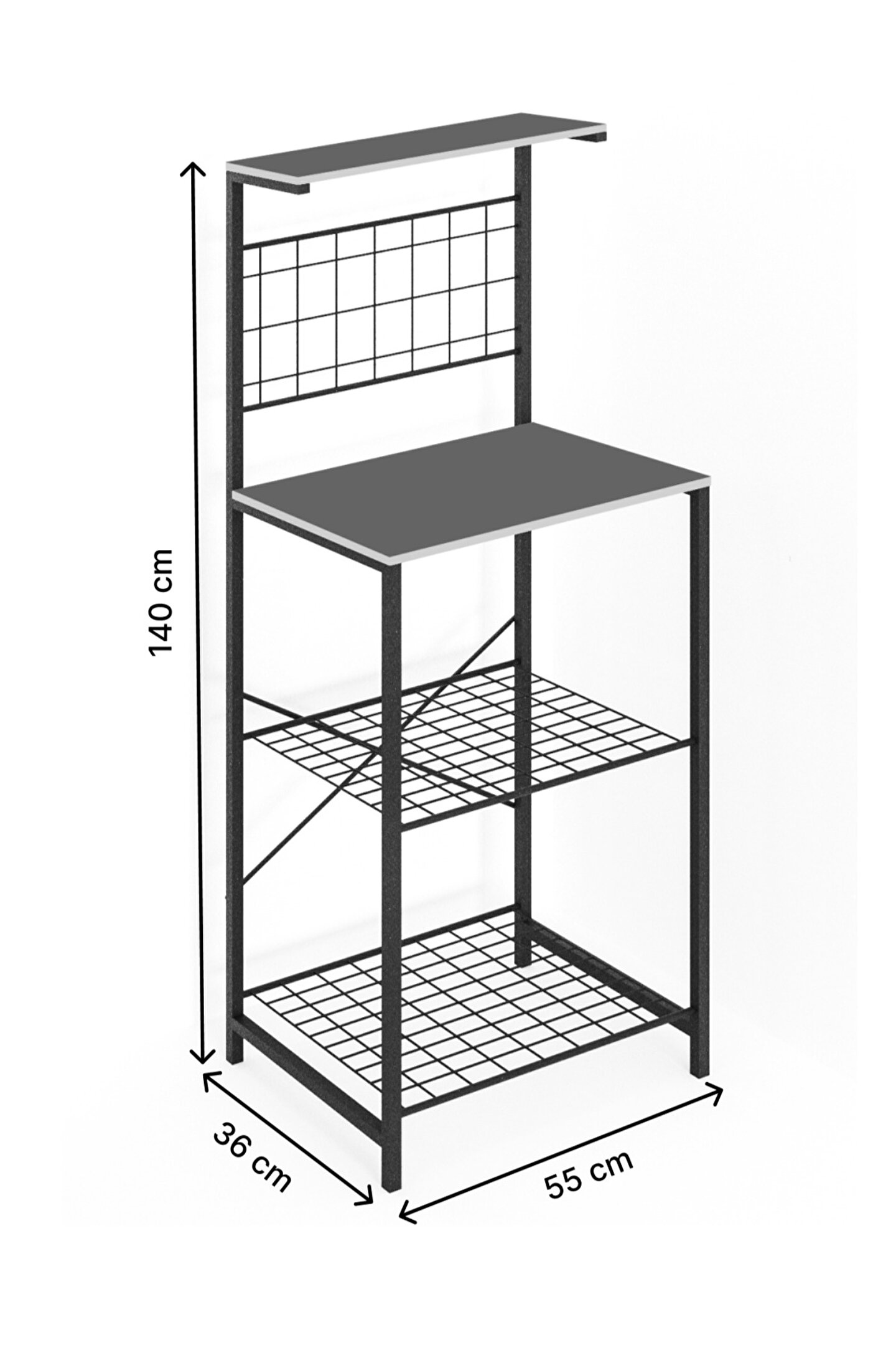 Çok Amaçlı Dolap Mutfak Bangosu Genel Boyut: 140 Cm yükseklik, 38 Cm derinlik, 55 cm eniyle geniş depolama alanı sağlar.; ; Çok Raflı Yapısı ile ekmek kızartma makinesi, baharat, tabaklar ve istediğiniz diğer şeyleri saklayabilirsiniz.; ; Dokulu bir yüzeye sahip, temizlenmesi kolay, çizilmez ve kaymayı önleyen yüksek kaliteli mdflam malzemeden üretilmiştir.; ; 20*20 profilden üretilen iskeleti elektrostatik kaplama yapılmış olup +100 kg taşıma kapasitesine sahiptir.; ; Modern sade moda, tüm farklı iç mekan ortamlarına uyar.; ; Çok amaçlı dolap; mikro dalga fırın, tost makinesi, kahve makinesi vs.; bir çok kullanım alanı sunmaktadır.; ;
