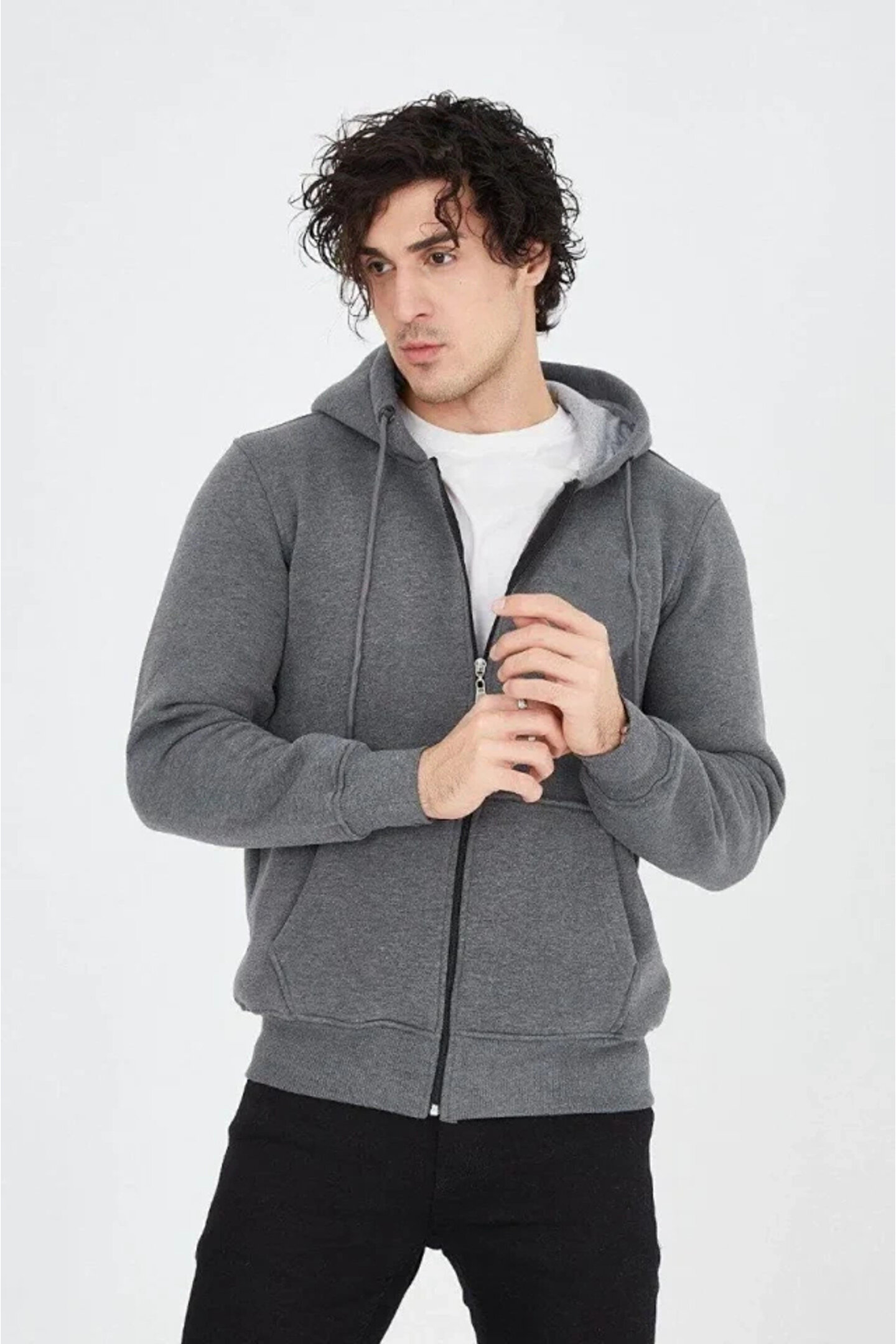 idimilla MDB Erkek Kapüşonlu Düz Fermuarlı Hırka Füme