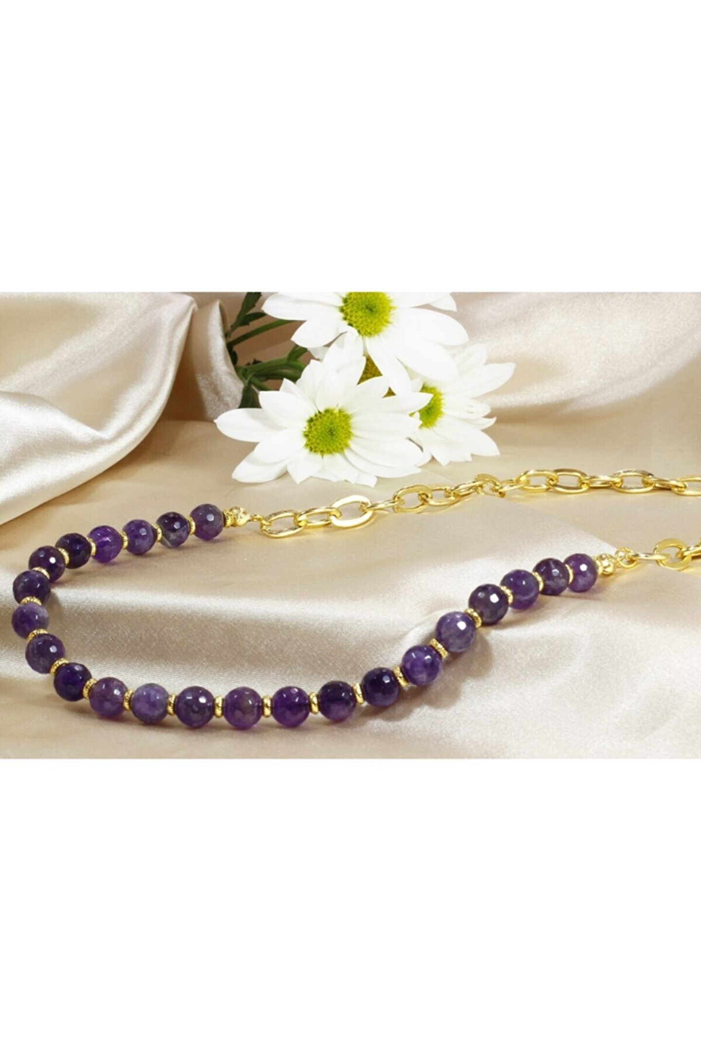 Altın Kaplama Zincirli Tasarım Kolye En tarz zincirlere en şifalı doğal taş yakışırdı. ; 2021 İlkbahar / Yaz modasının en iddaalı modellerinden biri şu an parmaklarınızın ucunda. ; Altın kaplama tarz zincirlerin parıltısı, faset kesimli ametist taşı ışıltısıyla buluştuğunda kendini özel hissetmek isteyen her kadın için muhteşem bir tasarım kolye ortaya çıktı. ; Butik olarak sınırlı sayıda özel tasarlanan Ametist Kolyeye sahip olmak için acele edin. ; Ametist Kolye tane ölçüleri 8 mm / Toplam Uzunluk 51 cm;