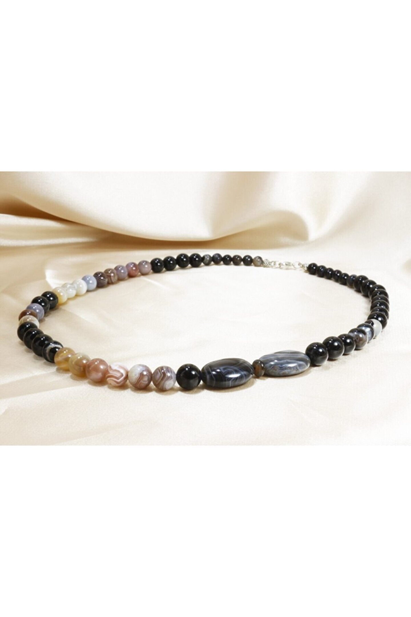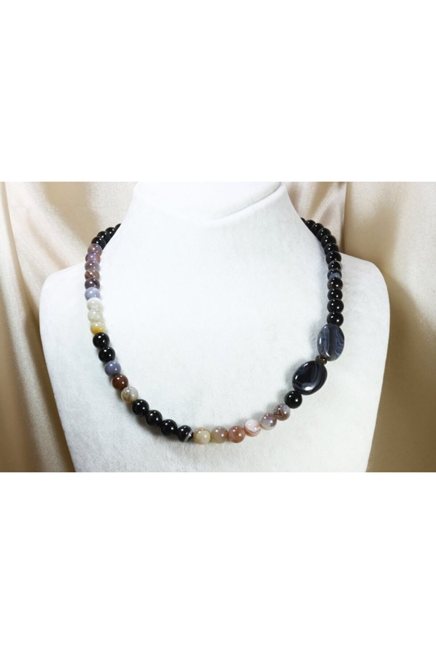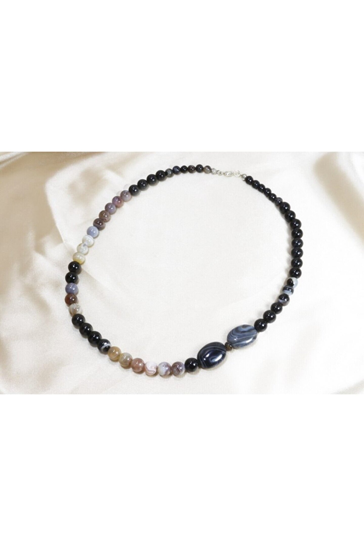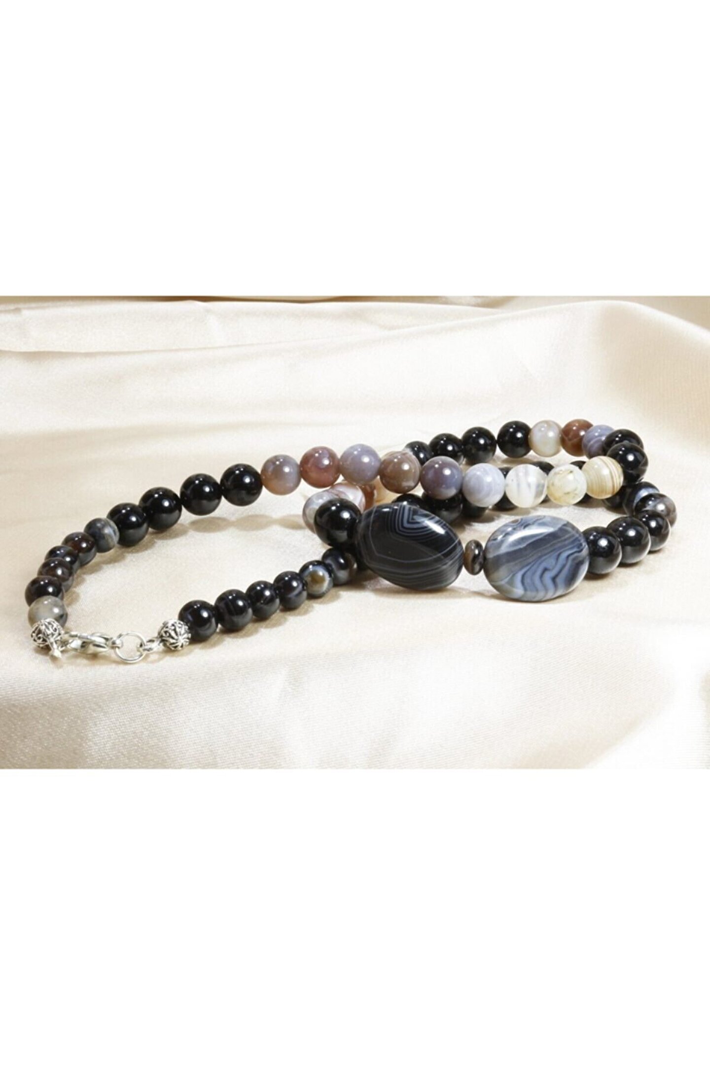 Özel Tasarım Doğal Taş / Siyah Akik ve Botswana Akik Akik taşının muhteşem harika çeşitleri sizin için özel tasarımıyla bir araya geldi. ; Muhteşem renk uyumu ve özel tasarım tarzı ile karma akik kolye, şık sade ve iddaalı tarzını yansıtmak isteyen kadınlar için harika bir tercih. ; Akik taşının dokusu ve desenleri de tasarımı gibi görenleri kendine hayran bıracak. ; Akik tane ebatları 6 - 8 mm / Akik Oval ölçüleri 2 x 1,5 cm / Kolye toplam uzunluk 50 cm;