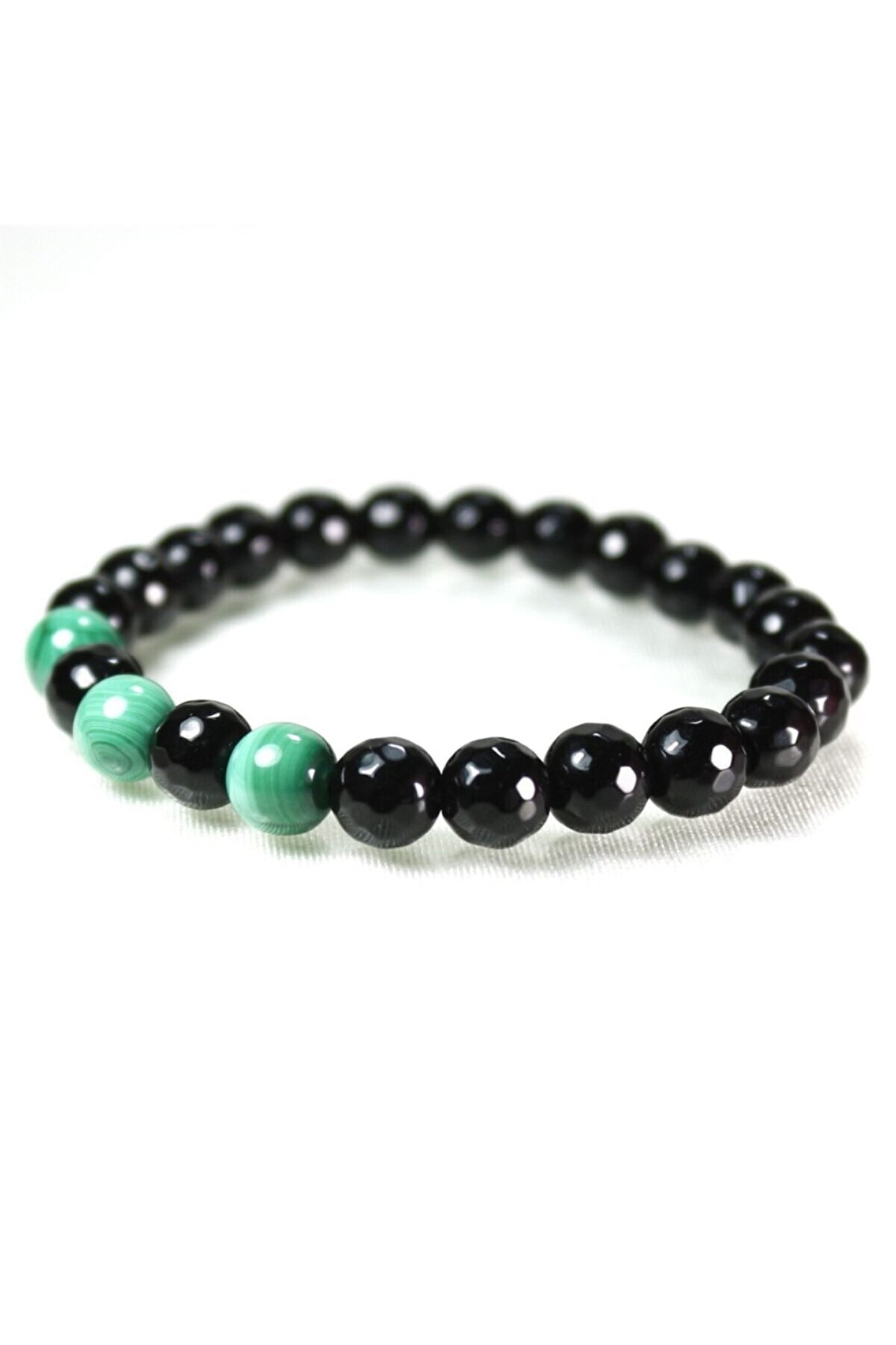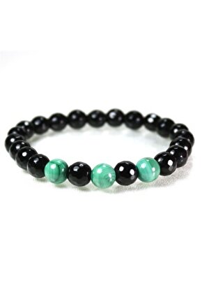 Doğal taş kullanımı sayesinde her bileklik benzersiz ve otantik bir görünüm sunar; Oniks ve malakit taşlarının uyumlu kombinasyonu, şıklığı ve doğallığı bir arada barındırır; Siyah ve yeşil renklerin asaletini yansıtan bu bileklik, her türlü kıyafetle kolayca uyum sağlar; Unisex tasarımı ile hem kadınlar hem de erkekler tarafından rahatlıkla tercih edilebilir;