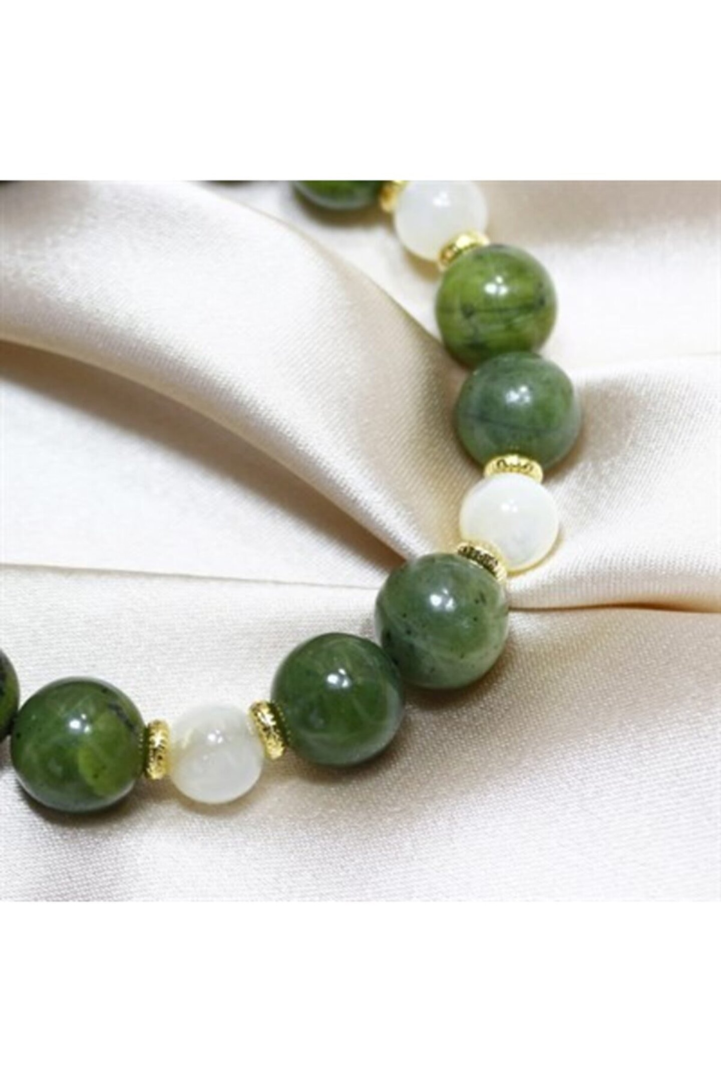Doğal taş kullanımı, her bir Yeşim bilekliğin benzersiz ve otantik bir görünüm kazanmasını sağlar; Altın kaplama detayları ile zarif ve şık bir parlaklık sunar, her türlü kıyafetle uyum sağlar; Özel tasarımıyla dikkat çeken bu bileklik, günlük kullanım için idealdir ve özel günlerde de şıklığınızı tamamlar;