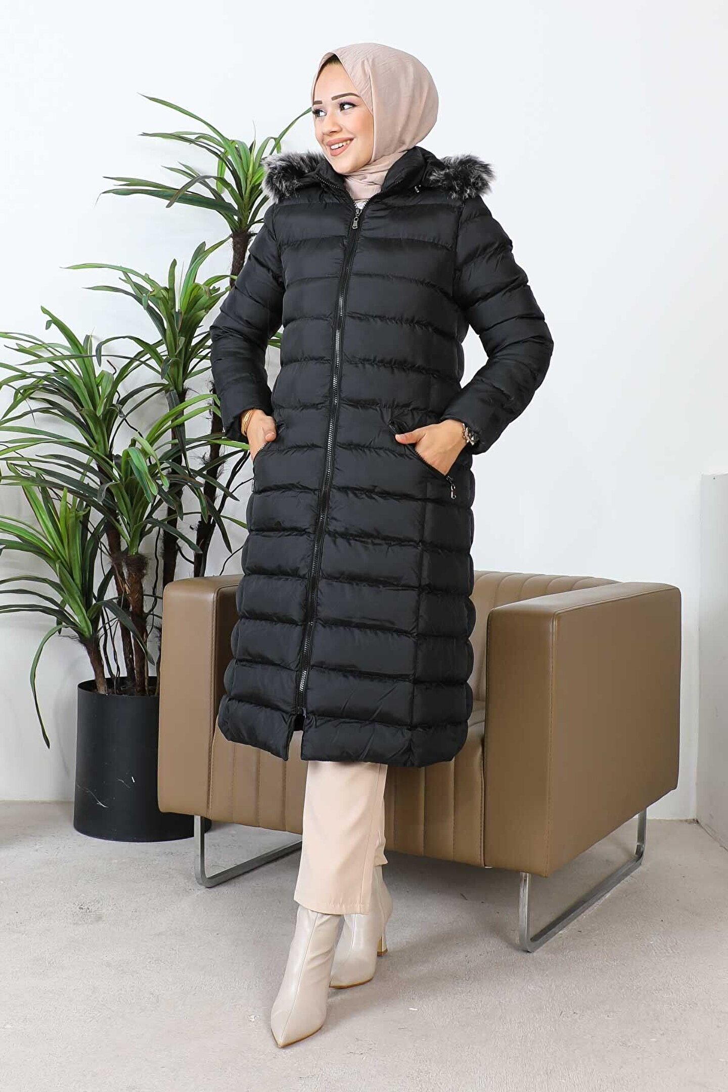 Siyah Kapüşonlu Fermuarlı Şişme Mont