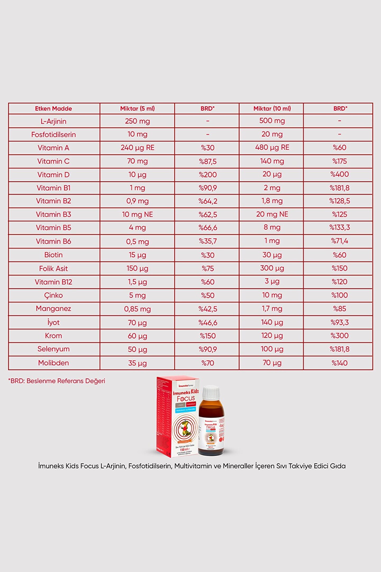 İmuneks Kids Focus L-Arjinin, Fosfotidilserin, Multivitamin ve Mineraller İçeren Sıvı Takviye Edici Gıda