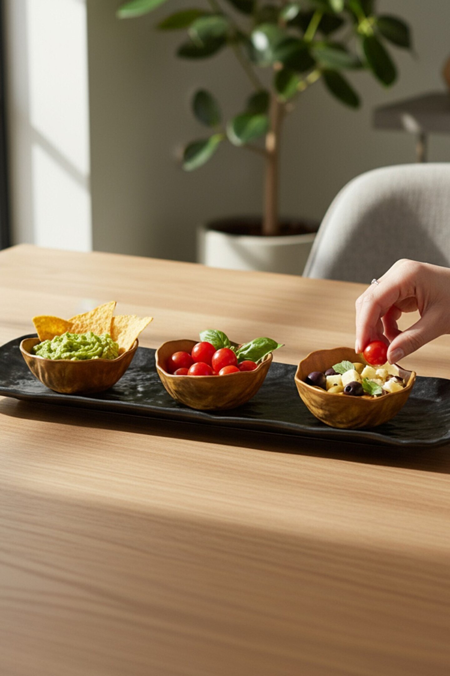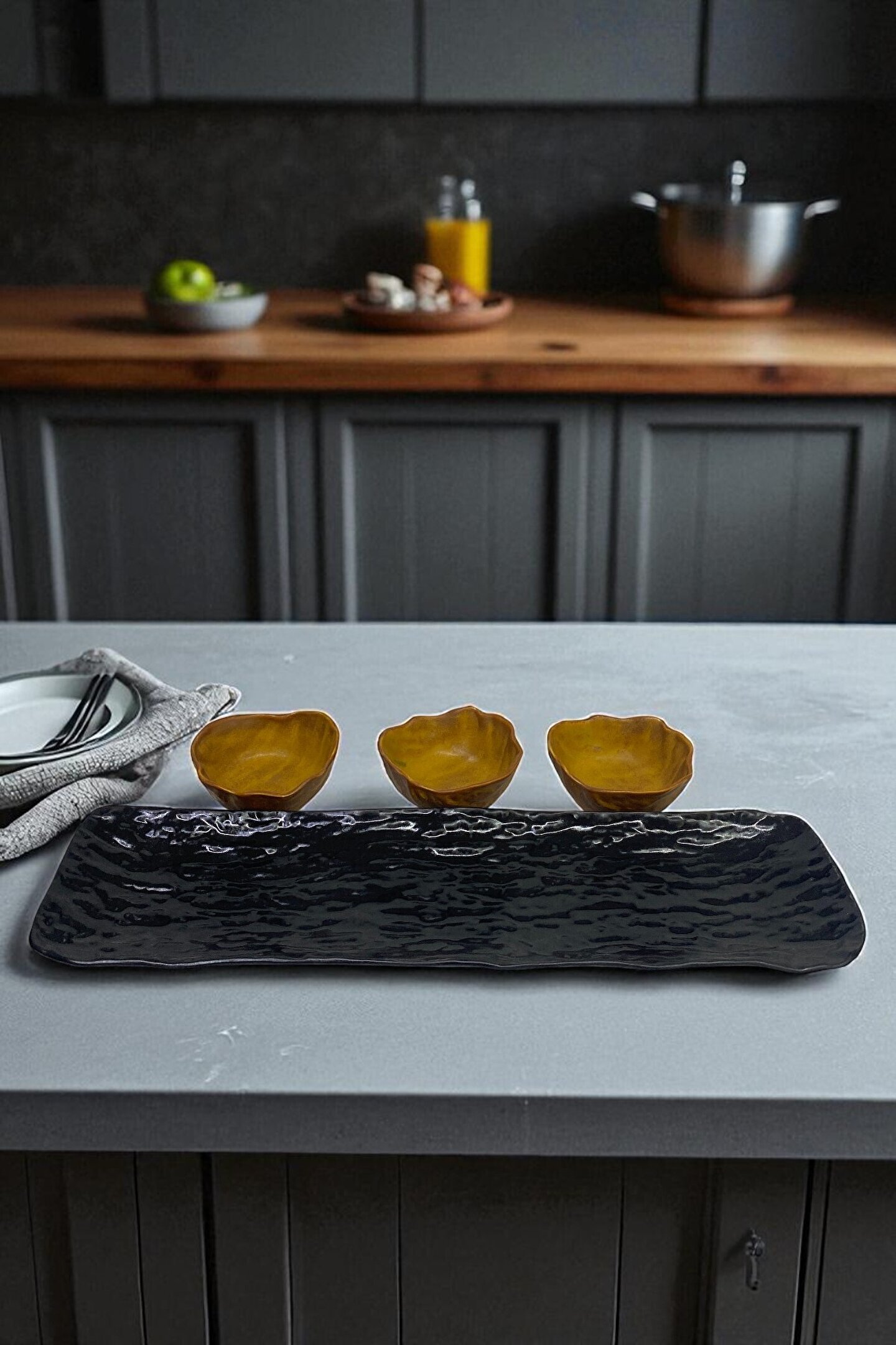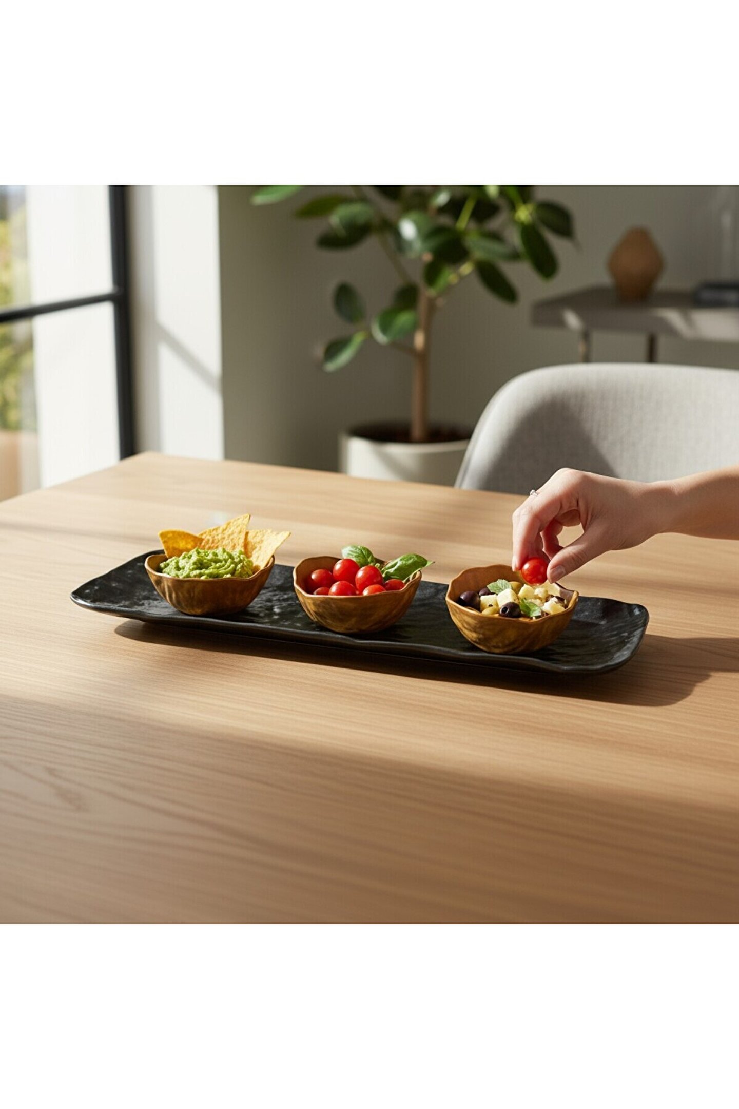 Wood 41 cm Porselen Kayık Sunum Tabağı 1 Adet / Porselen Sosluk Kase 9cm 3 Adet