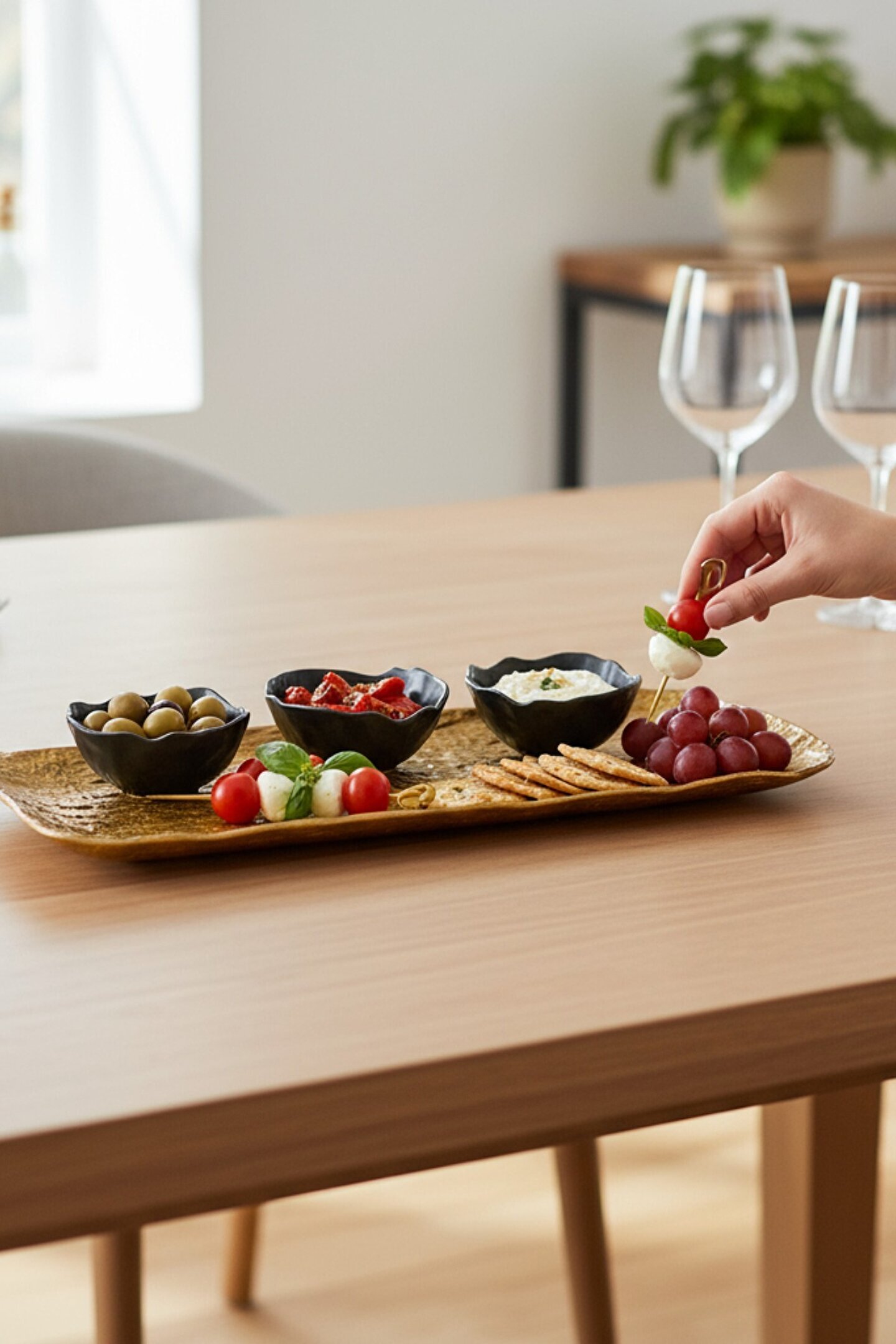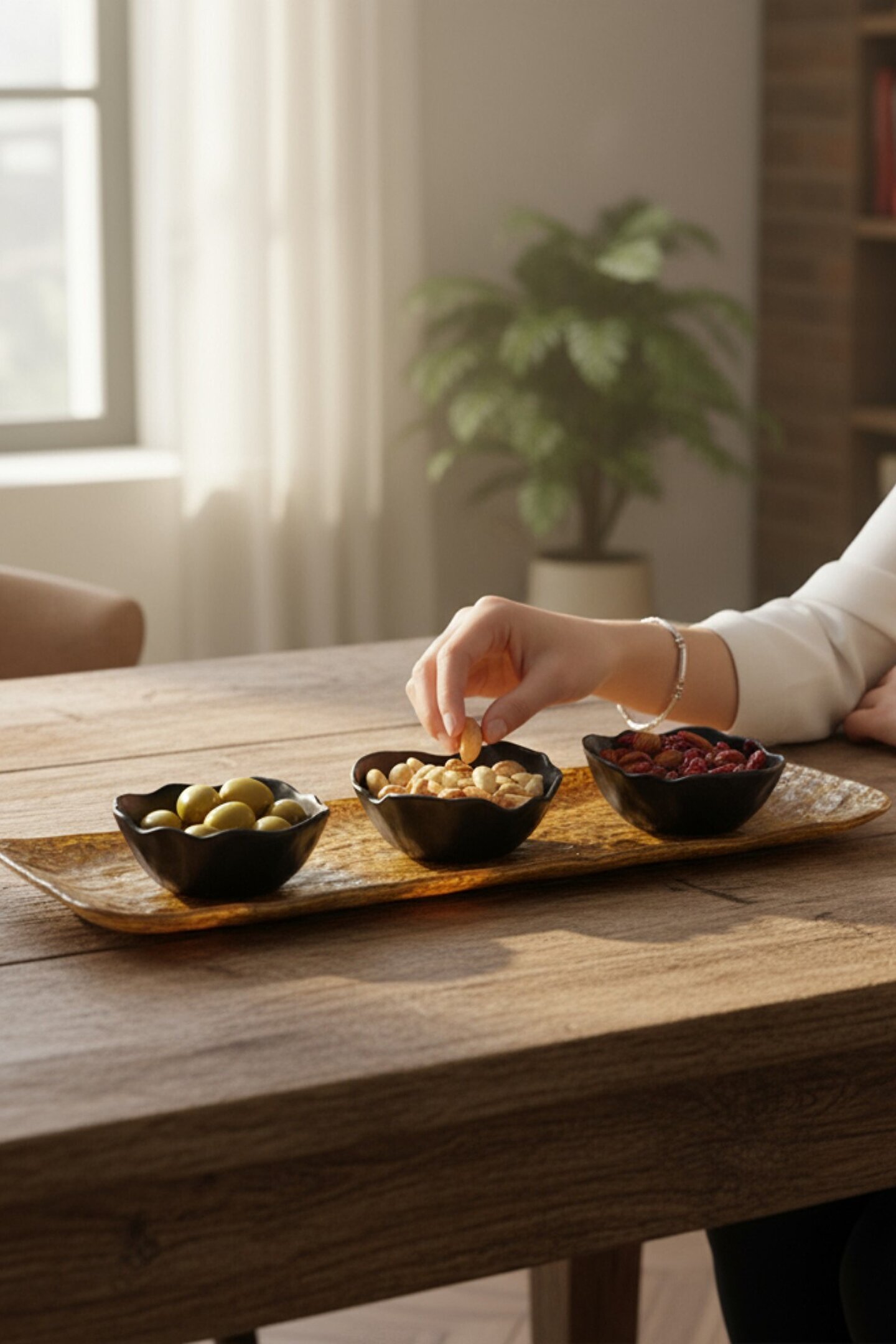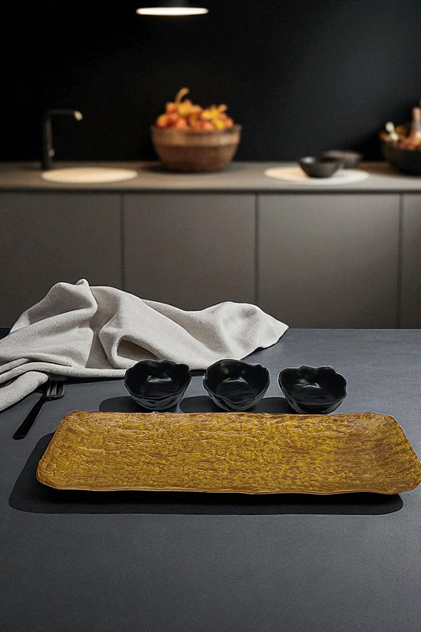 Wood 41 cm Porselen Kayık Sunum Tabağı 1 Adet / Porselen Sosluk Kase 9cm 3 Adet