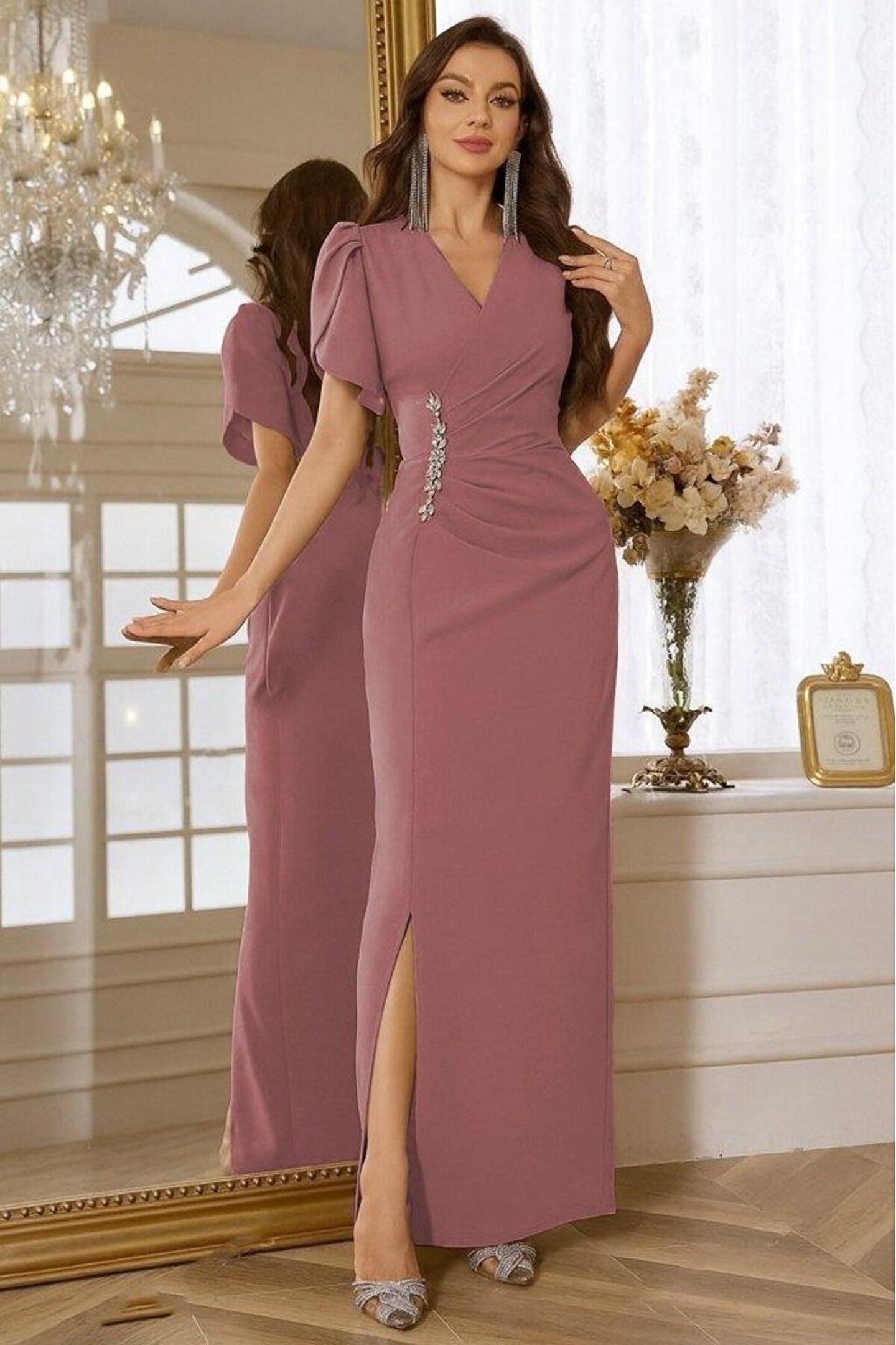 Kadın Kısa Kollu Kruvaze Yakalı Belden çiçek Aksesuarlı Yırtmaçlı Ithal Krep Elbise