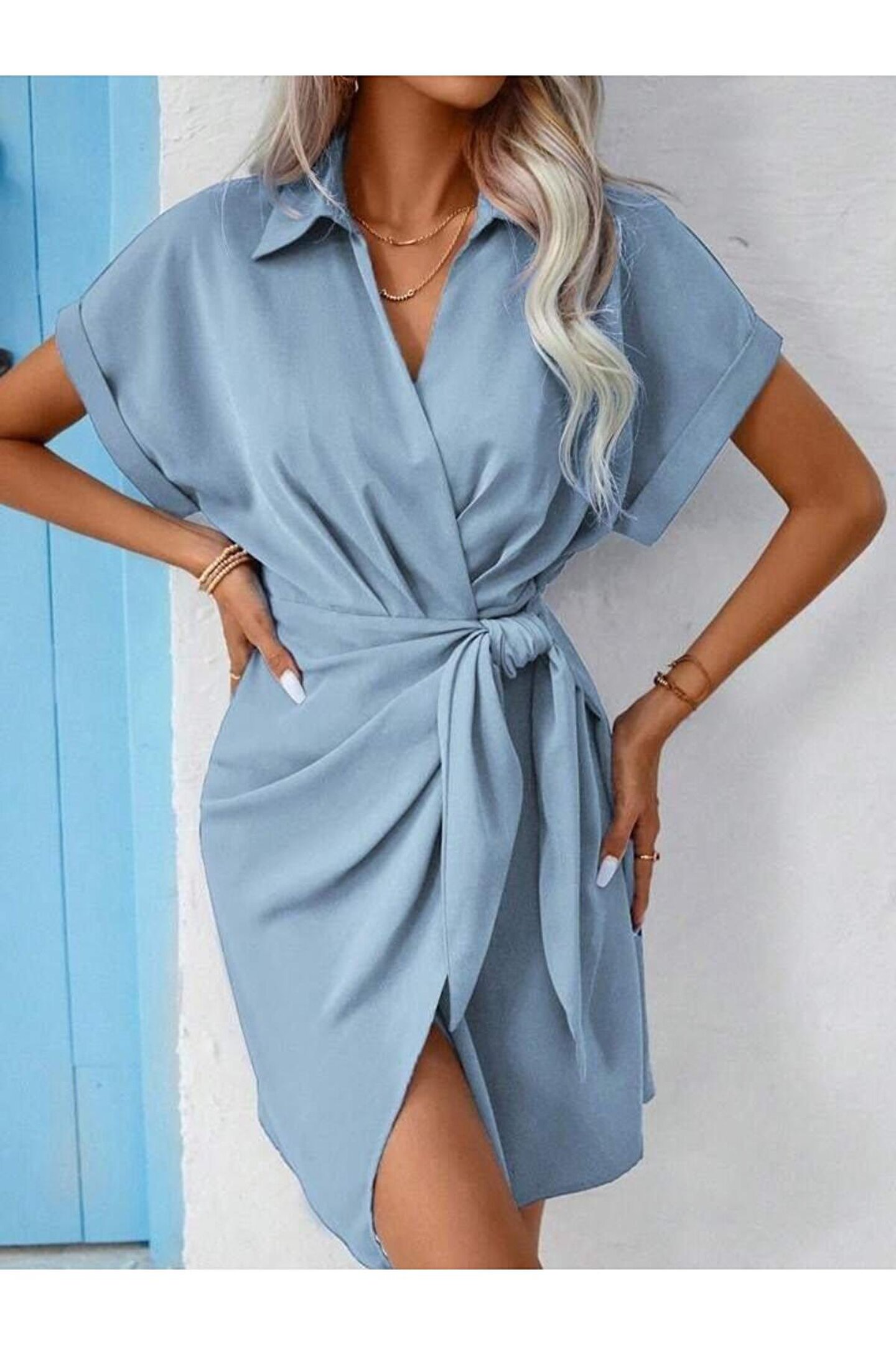Kadın Kısa Kollu Yakalı Yandan Bağlamalı Dokuma Elbise