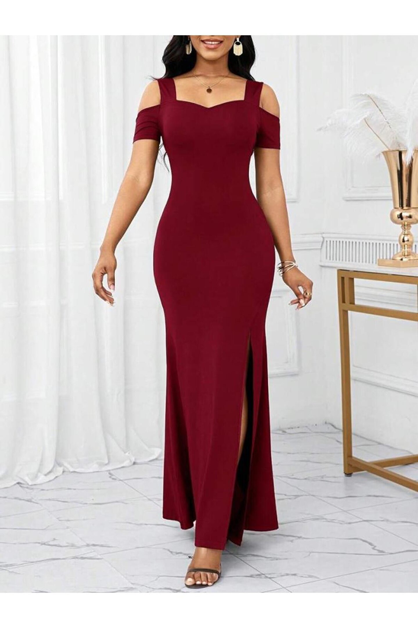 Kadın Omuzlardan Açık Askılı Yırtmaç Detaylı Uzun Ithal Krep Elbise