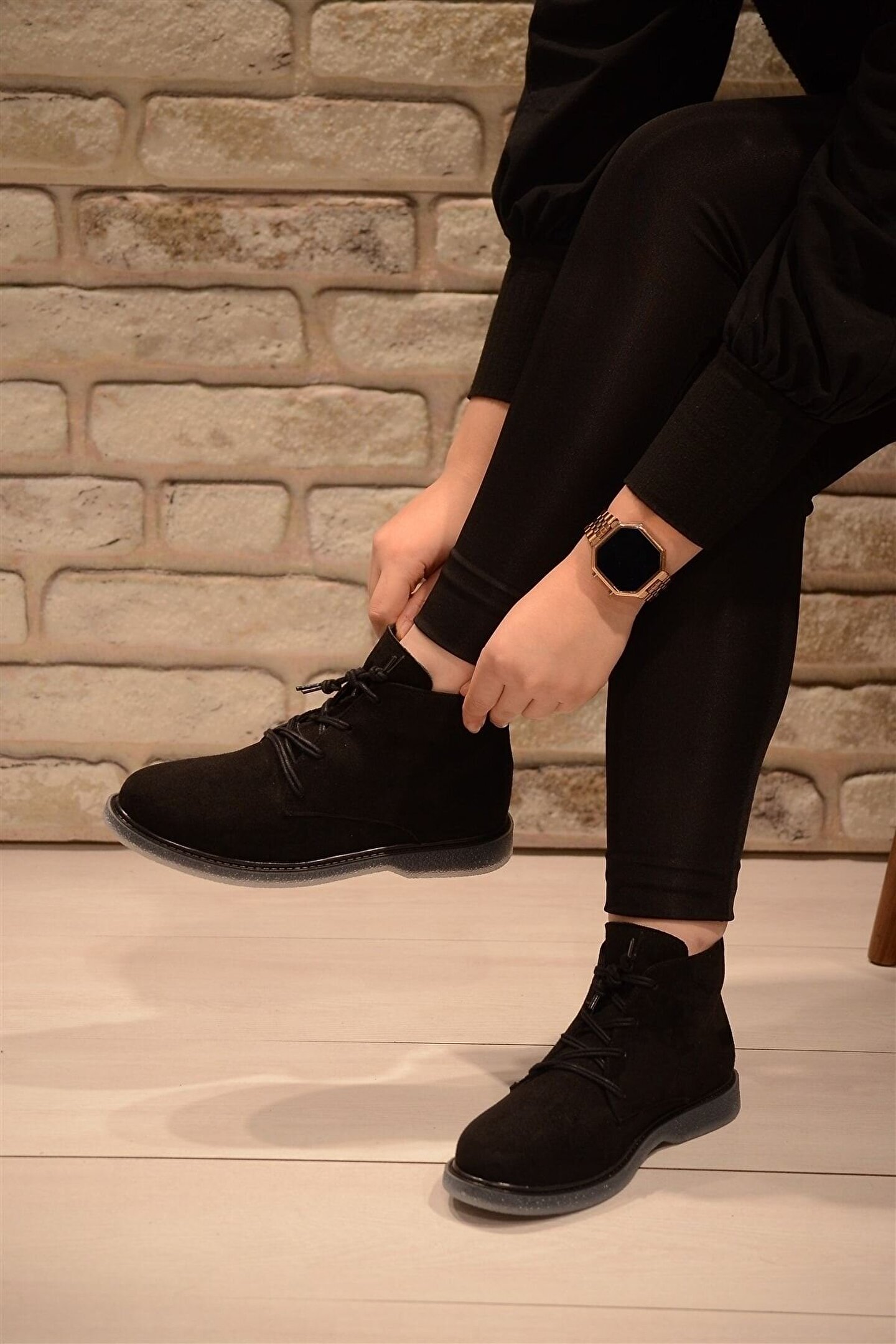 Kadın Siyah Süet Bağlı Haşpapi Düz Taban Bot&bootie