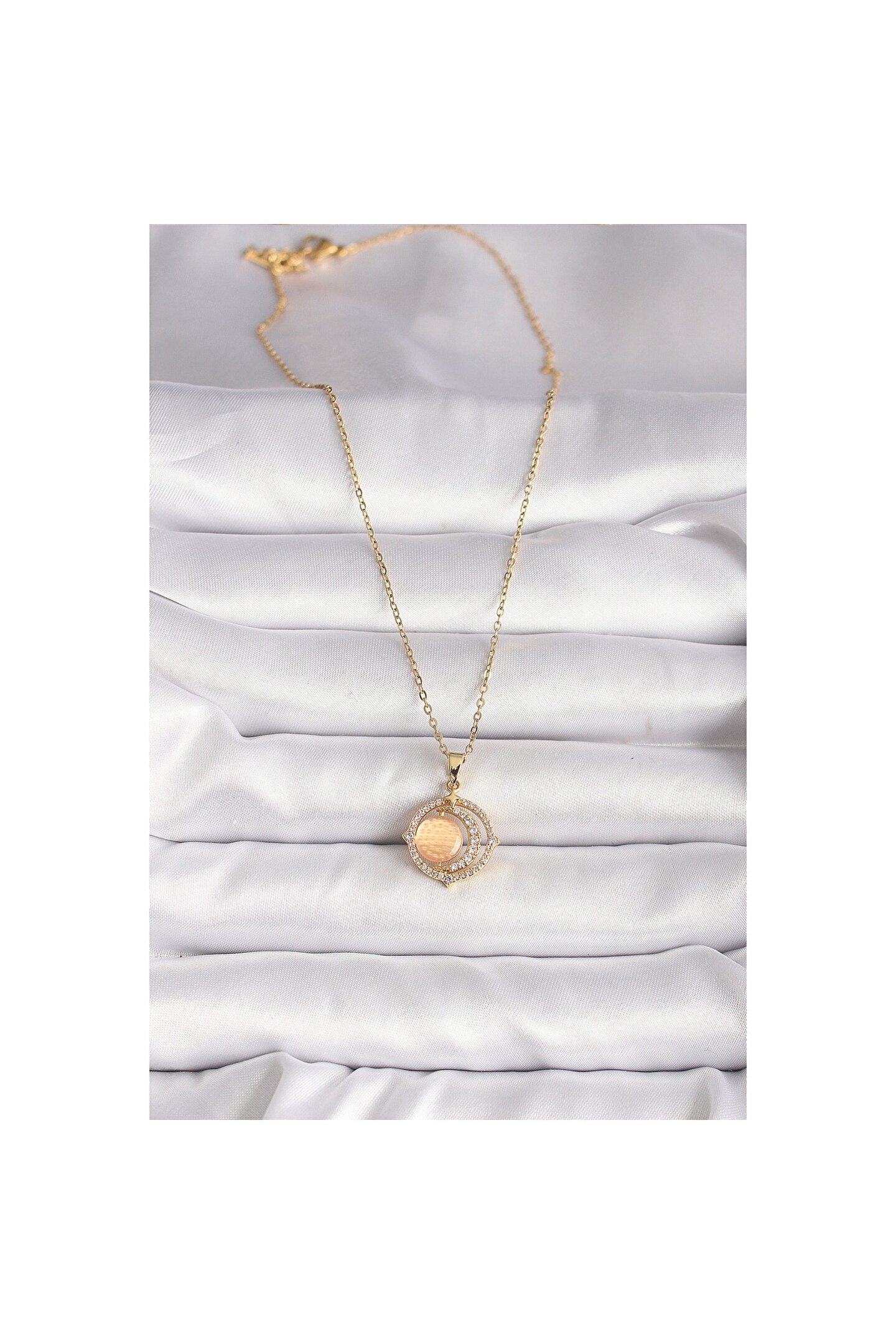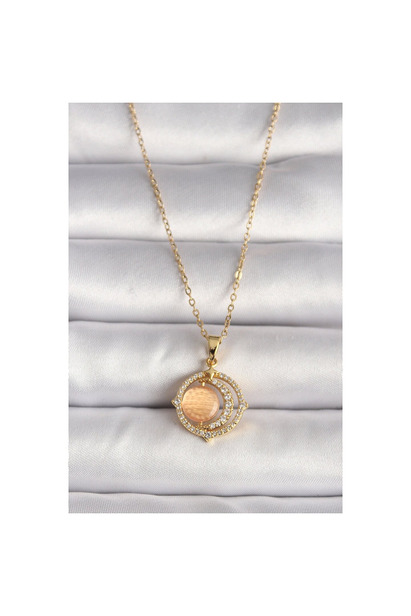 ithalnet 316L Çelik Gold Renk Zirkon Taşlı Turuncu Sedefli Hilal Model Kadın Kolye