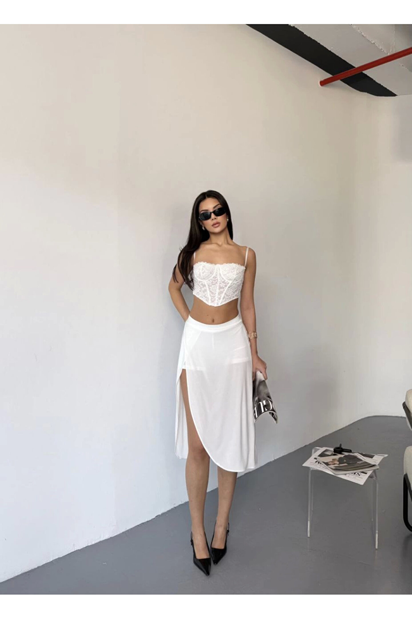 Çepli Şortlu Yırtmaçlı Etek - Beyaz