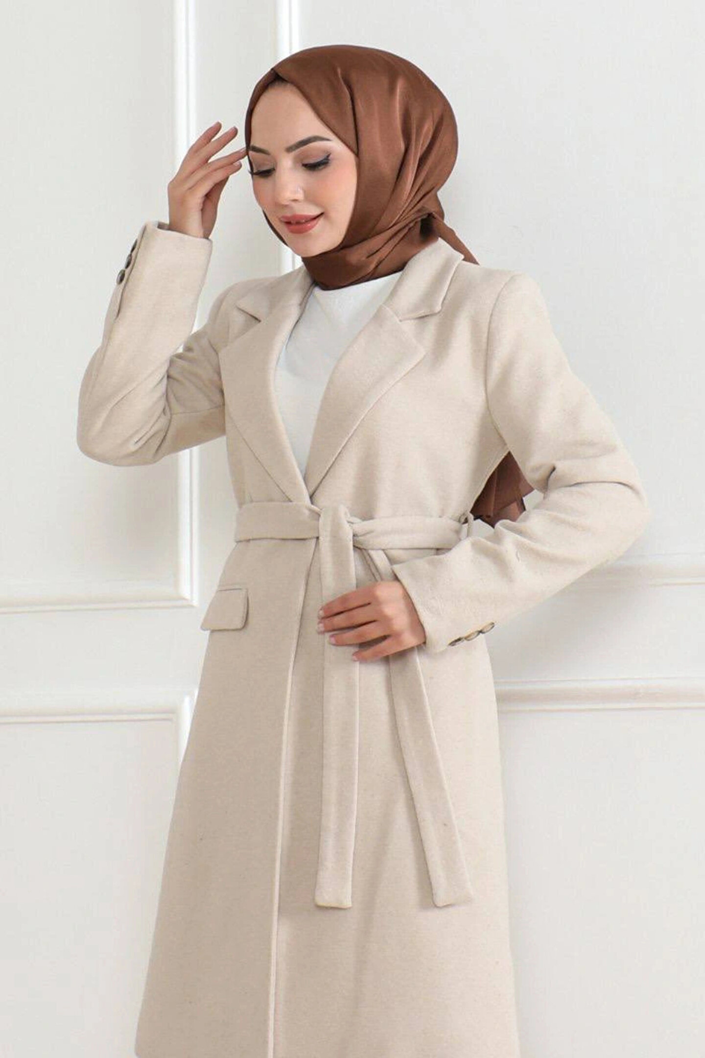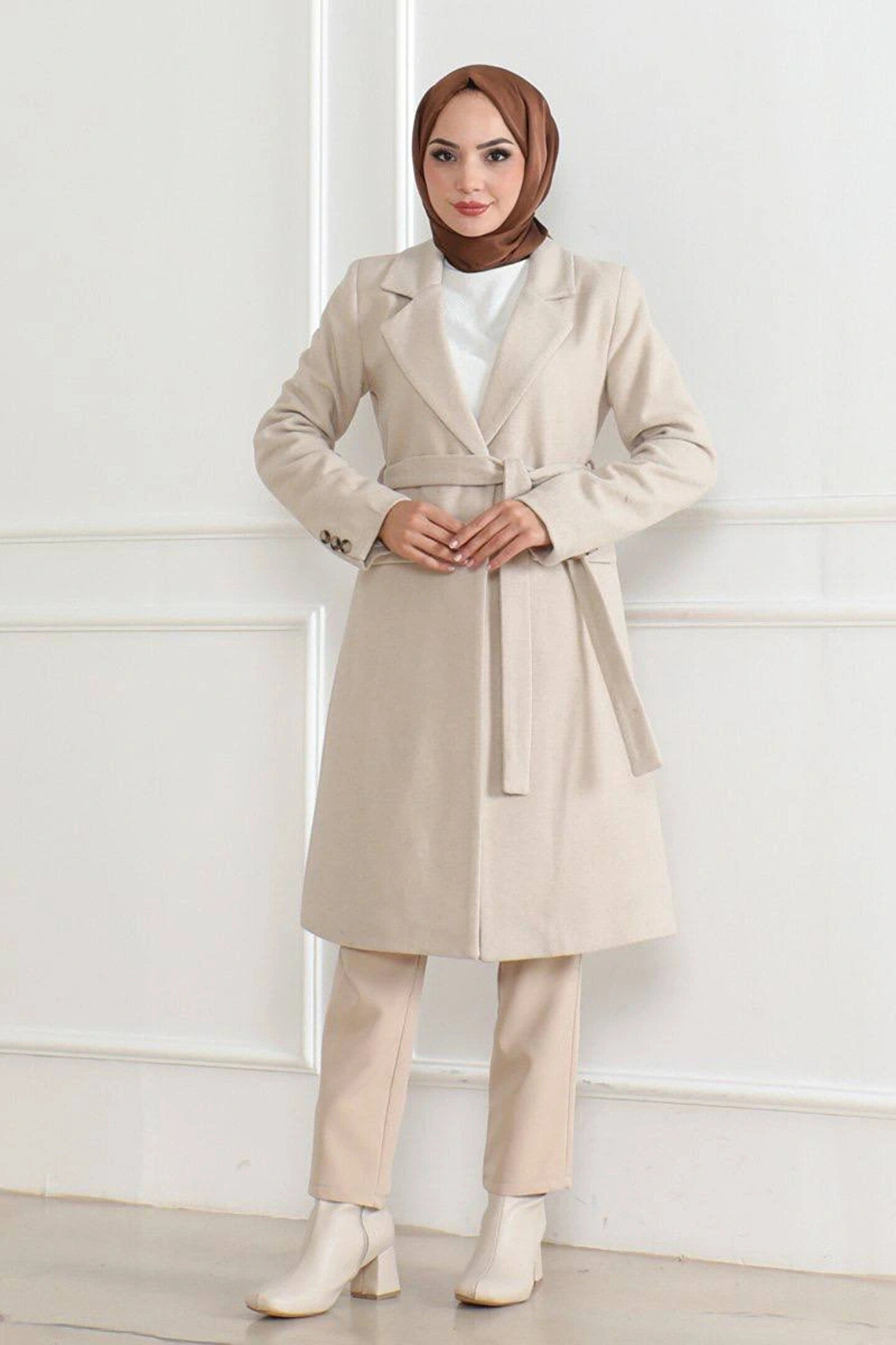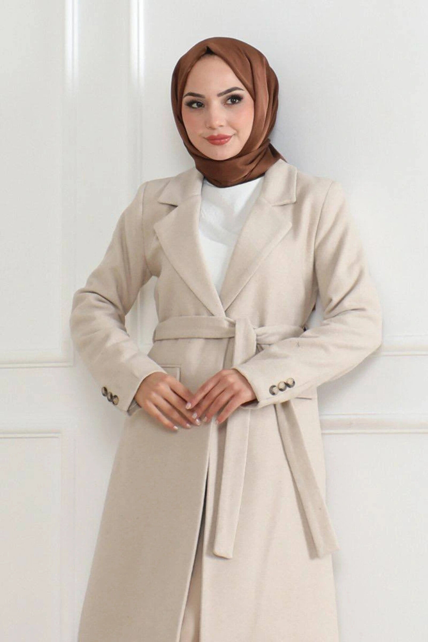 IVORA WEAR Kadın Kaşe Kaban – Uzun Boy Kruvaze Yaka, Kuşaklı Tesettür Kışlık Kaban, Astarlı Şık Yünlü Dokuma Ov