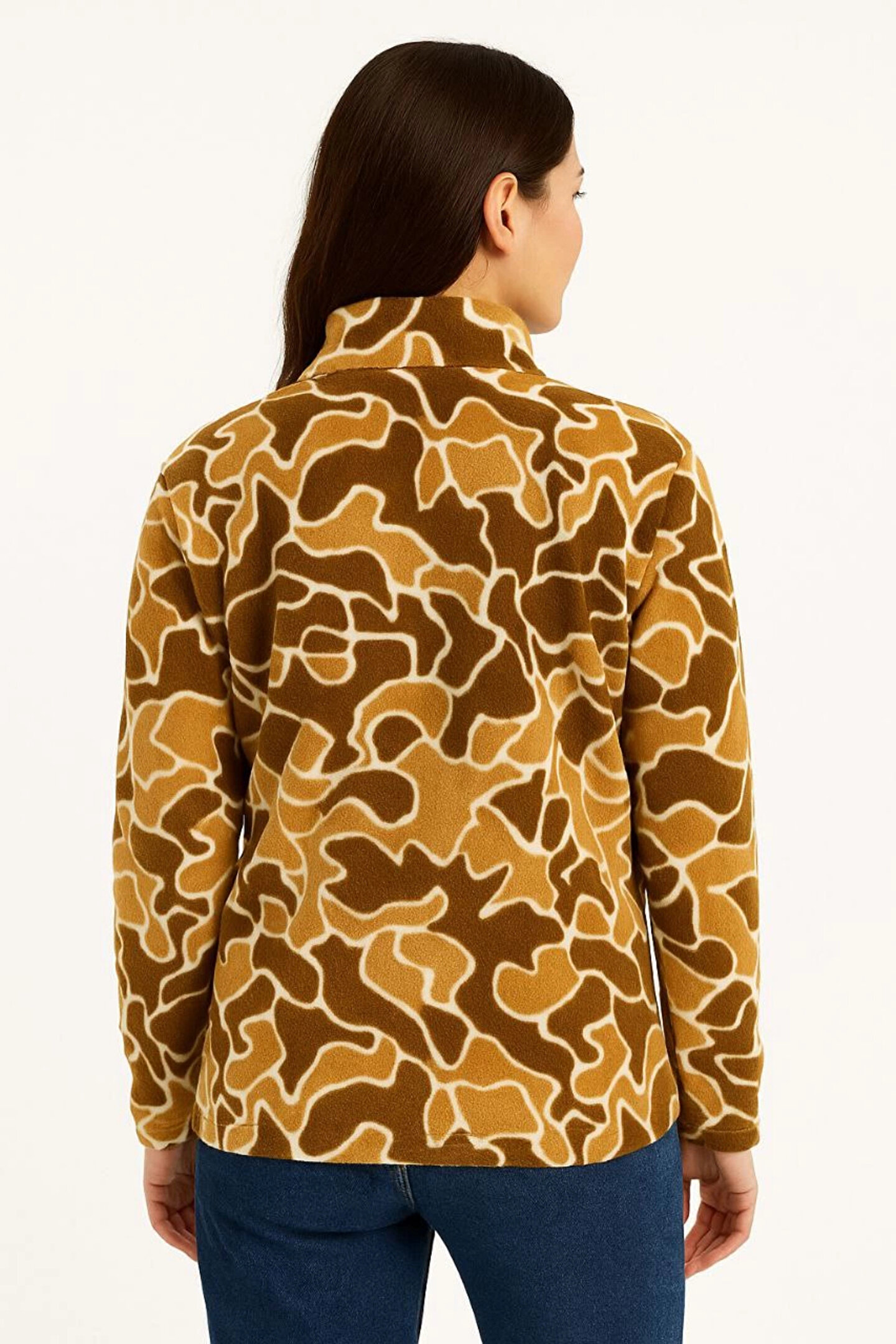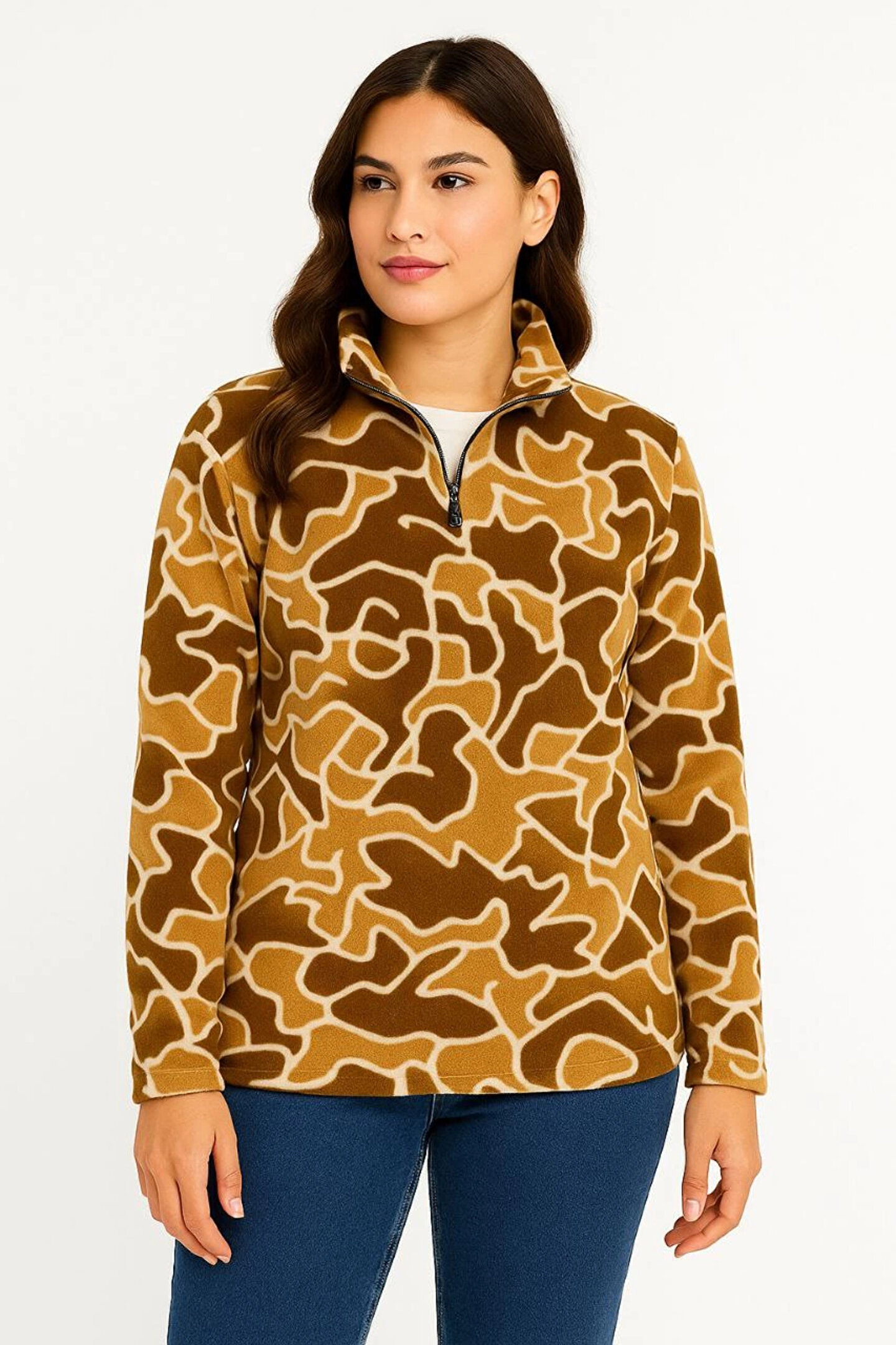 IVORA WEAR KADIN Yarım Fermuarlı Desenli Polar Sweat Yakalı, Uzun Kollu, Oversize Rahat Kalıp - Kahverengi