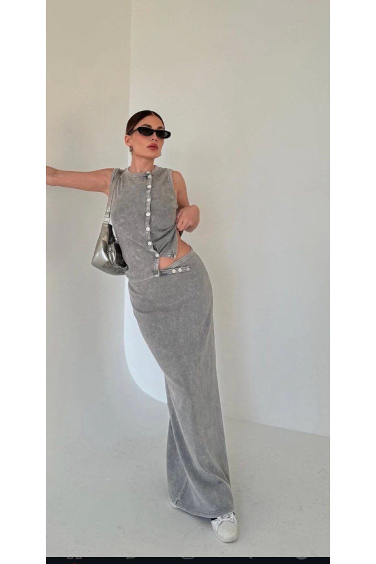 Uzun Etekli Önü Düğmeli Badi İkili Takım- Gri