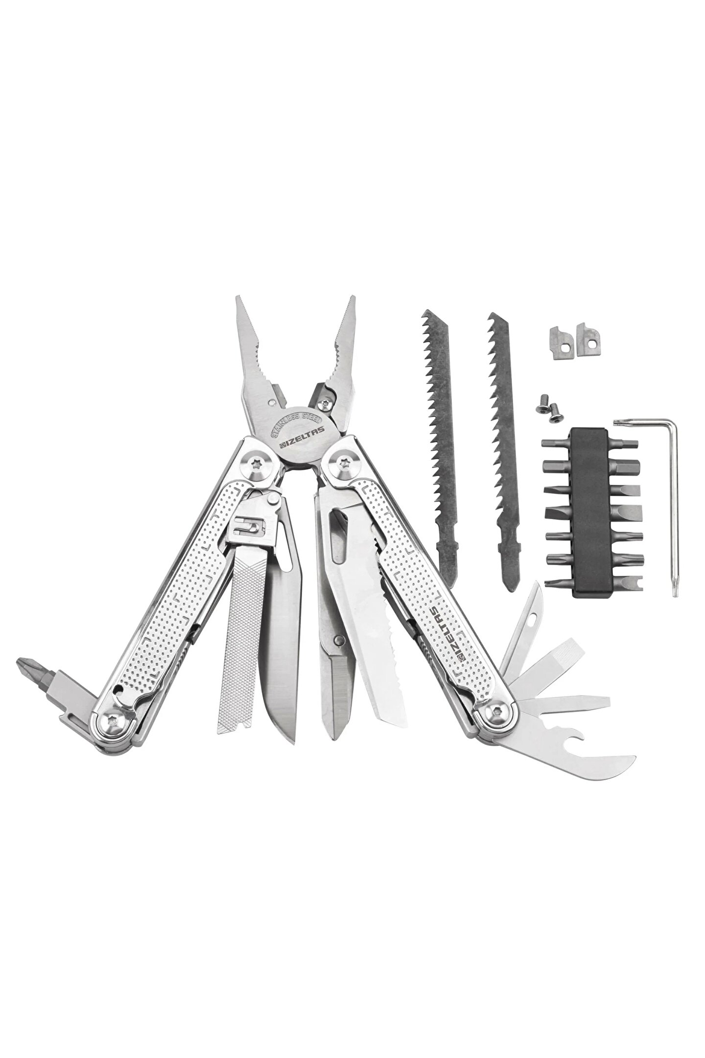 - 15 farklı fonksiyona sahip, çok amaçlı pense çakı seti ile günlük işlerinizi kolayca halledin.; - 180 mm uzunluğundaki bu set, çeşitli görevlerde rahat kullanım sağlar.; - Menşei Türkiye olan bu ürün, yerel üretim kalitesini yansıtır ve dayanıklılık sunar.; - Çok yönlü tasarımı sayesinde anahtarlık, tornavida, cımbız gibi temel aletleri tek bir pakette bulundurur.; - Taşınabilirliği yüksek olan bu set, her zaman yanınızda taşıyabileceğiniz pratik bir çözüm sunar.