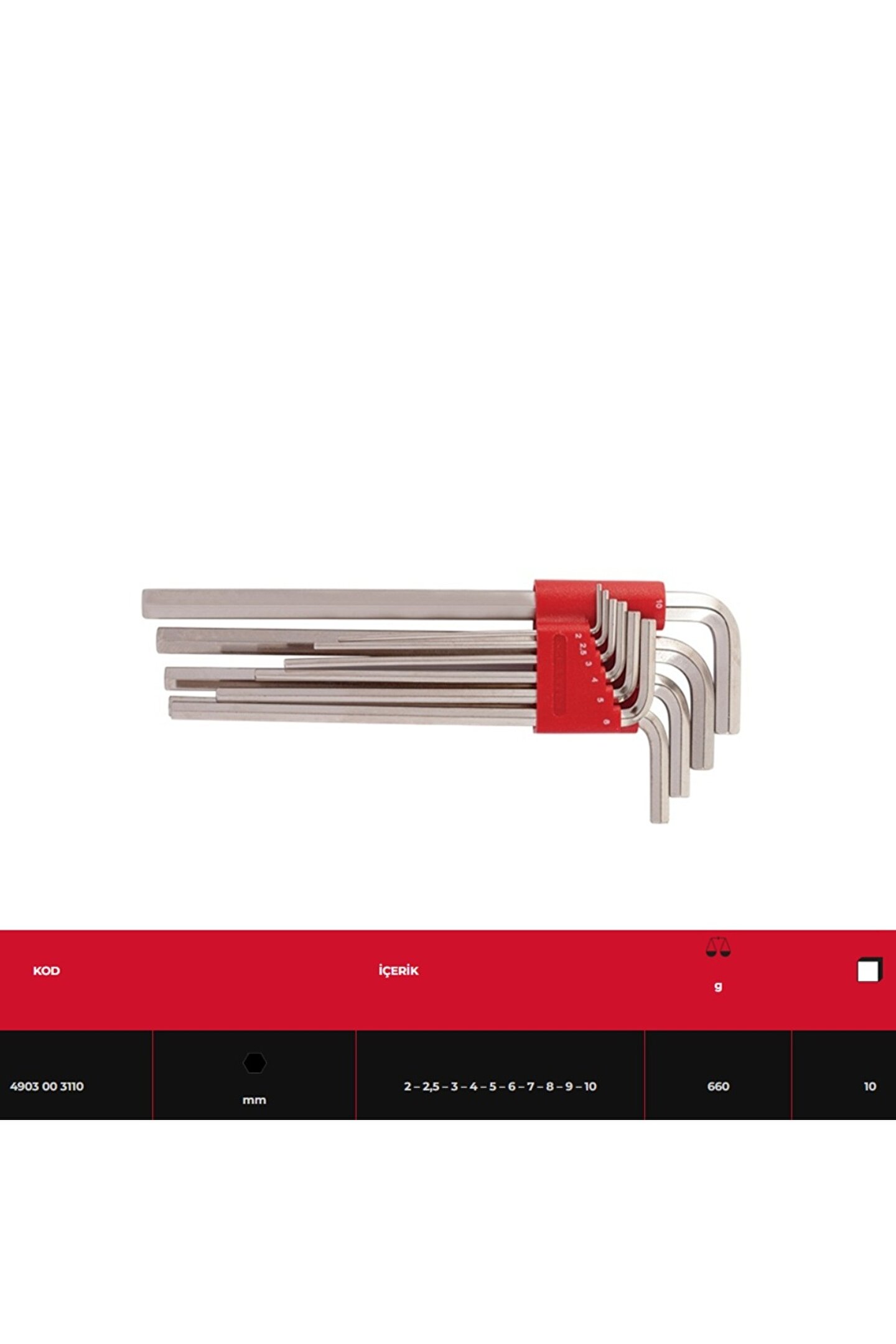 İzeltaş 4903 Allen Anahtar Takımı Altı Köşe Uzun Boy - 10 Parça Ürün fotoğrafı temsil amaçlıdır.; Fotoğrafta görülen ürün, aşağıdaki içerik ile gönderilecektir.; Ürün Kodu : 4903 00 3110Paket İçeriği (mm) : 2 - 2.5 - 3 - 4 - 5 - 6 - 7 - 8 - 9 - 10Ağırlık (gr) : 660Paket İçeriğindeki Ürün Adedi : 10TSE