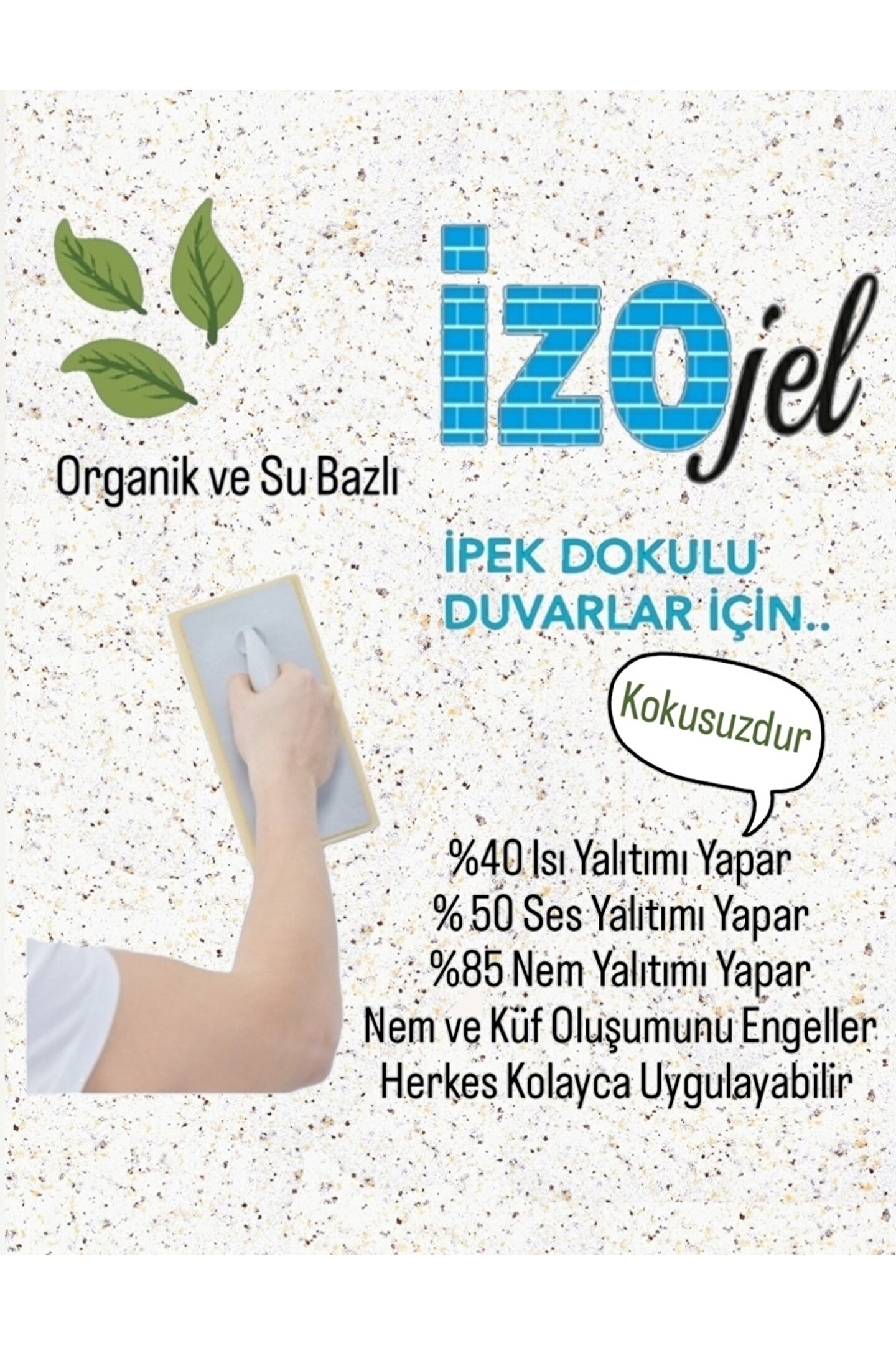 İZOJEL İPEK SIVA DEKORATİF DUVAR SIVASI ÖZELLİKLERİ ; %100 ORGANİK ve DOĞALDIR, DEKORATİFTİR; DUVARDAKİ KUSUR VE ÇATLAKLARI YOK EDER. - %40 ISI YALITIMI - % 50 SES YALITIMI - %85 NEM YALITIMI SAĞLAR. - HER TÜRLÜ YÜZEYE UYGULANABİLİR. - RENK SEÇENEĞİ ÇOK FAZLADIR. - UYGULANMASI KOLAY VE HIZLIDIR. TAMİR EDİLEBİLİR. - KOKUSUZDUR. RENGİ ZAMANLA DEĞİŞMEZ. - ALEV ALMAZ. YANGINA KARŞI DAYANIKLIDIR. - DARBELERE KARŞI DAYANIKLIDIR. - DUVARIN NEFES ALMASINI ENGELLEMEZ. - BÖCEK BARINDIRMAZ. - ANTİSTATİKTİR. ORGANİK YAPIDAKİ İZOJEL DEKORATİF YALITIM İPEK SIVASI Her türlü yüzeye uygulanabilir: Seramik , Beton, Cam, Sıva, Tuğla, Ahşap, Gaz Beton, Boyalı Yüzeyler. YÜZEYDEKİ BOŞLUKLARI DOLDURUR, ÇATLAMAZ. Silinebilir ve tamir edilebilir özelliktedir. Kendinden yapışkanlıdır. Örtücülüğü yüksektir. Yeni Teknoloji Organik Dekoratif Yalıtım Sıvası Doğa dostudur. İnsan sağlığına kesinlikle zararı yoktur. Uygulanacak yüzeylere önceden herhangi bir işlem yapılması gerekmez. Eski boyaların sökülmesi, yüzeylerin kazınması, macun veya sıva çekilmesi gerekmez. Uygulanacak yüzeyin sadece KURU olması yeterlidir. Uygulama esnasında ekstra bir malzemeye gerek yoktur. Her sıcaklıkta uygulama yapılabilir. Sarfiyat: Yüzeye tek kat uygulama yapılması yeterlidir. Ürünün yüzeye uygulama kalınlığı 1,6 mm ile 2 mm arasında olmalıdır. Depolama: Oda sıcaklığı depolama için uygundur. Özel bir ortamda depolama gerektirmez. İZOJEL İPEK SIVA DEKORATİF DUVAR SIVASI NASIL HAZIRLANIR? BİR KABIN İÇERİSİNE 5 LT SU KONULUR. 1 PAKET ÜRÜN SUYUN İÇERİSİNE BOŞALTILIR. YAKLAŞIK 10 DK KARIŞTIRILIR. DAHA SONRA 30 DK KADAR DİNLENDİRİLİP DUVARA PLASTİK MALA İLE UYGULANIR. UYGULAMA ESNASINDA MALAYI 5 DERECE AÇI İLE TUTMANIZ İŞİNİZİ KOLAYLAŞTIRACAKTIR. 1 PAKET İPEK SIVA İLE YAKLAŞIK 4 M2 ALAN KAPLANABİLİR. YÜZEYE UYGULANAN ÜRÜN 12 İLE 24 SAAT ARASINDA KURUR.