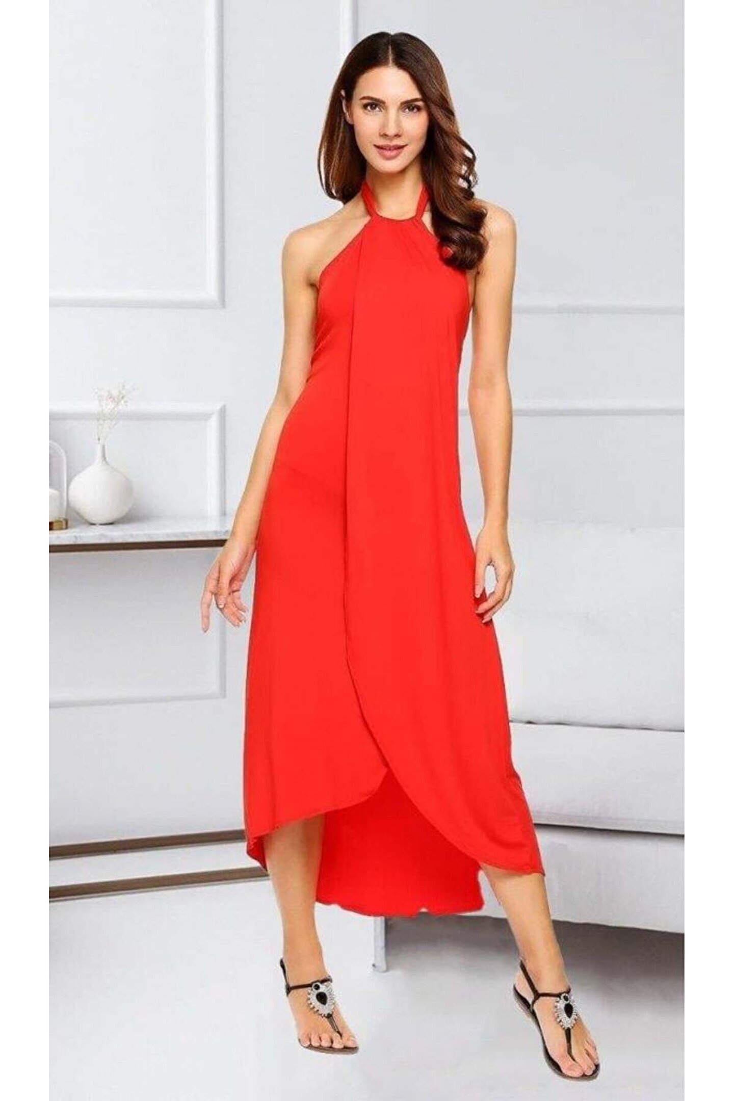 Boyun Askılı Eteği Kruvaze Kesim Viskon Kumaş Elbise