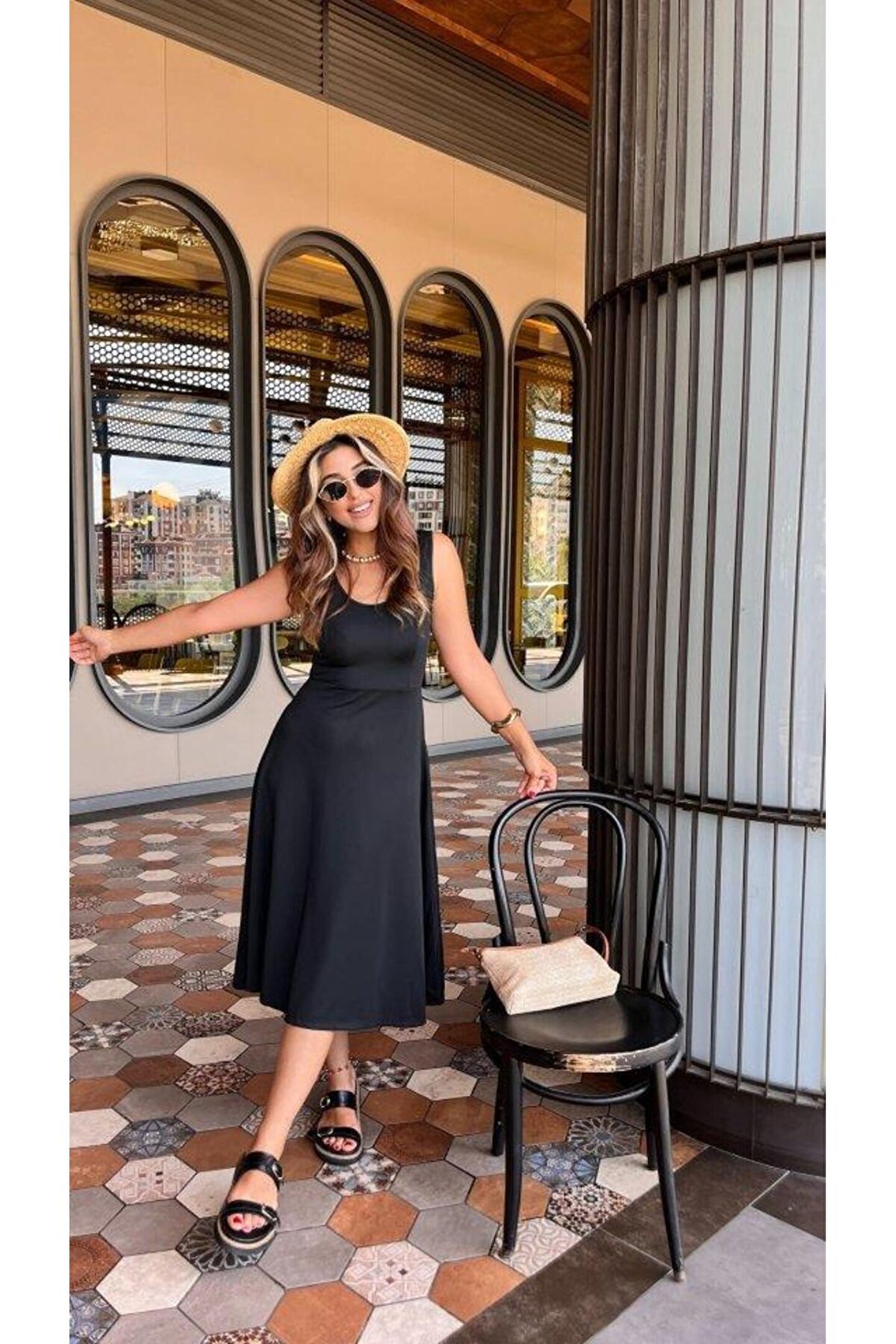 Kadın Askılı Kare Yakalı Midi Ithal Krep Elbise