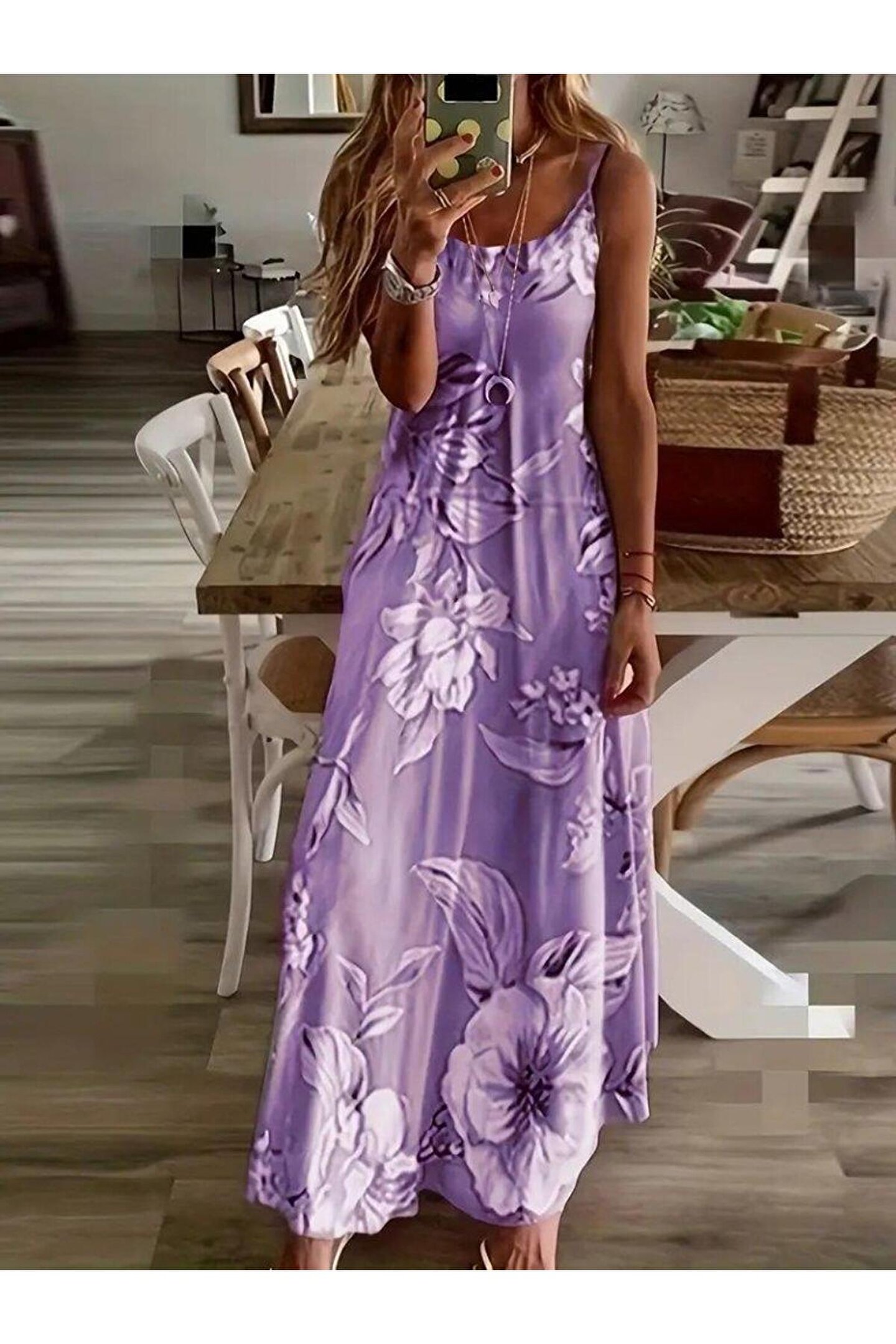 Kadın Askılı Yuvarlak Yaka Etek Geniş Kesim Desenli Süprem Elbise