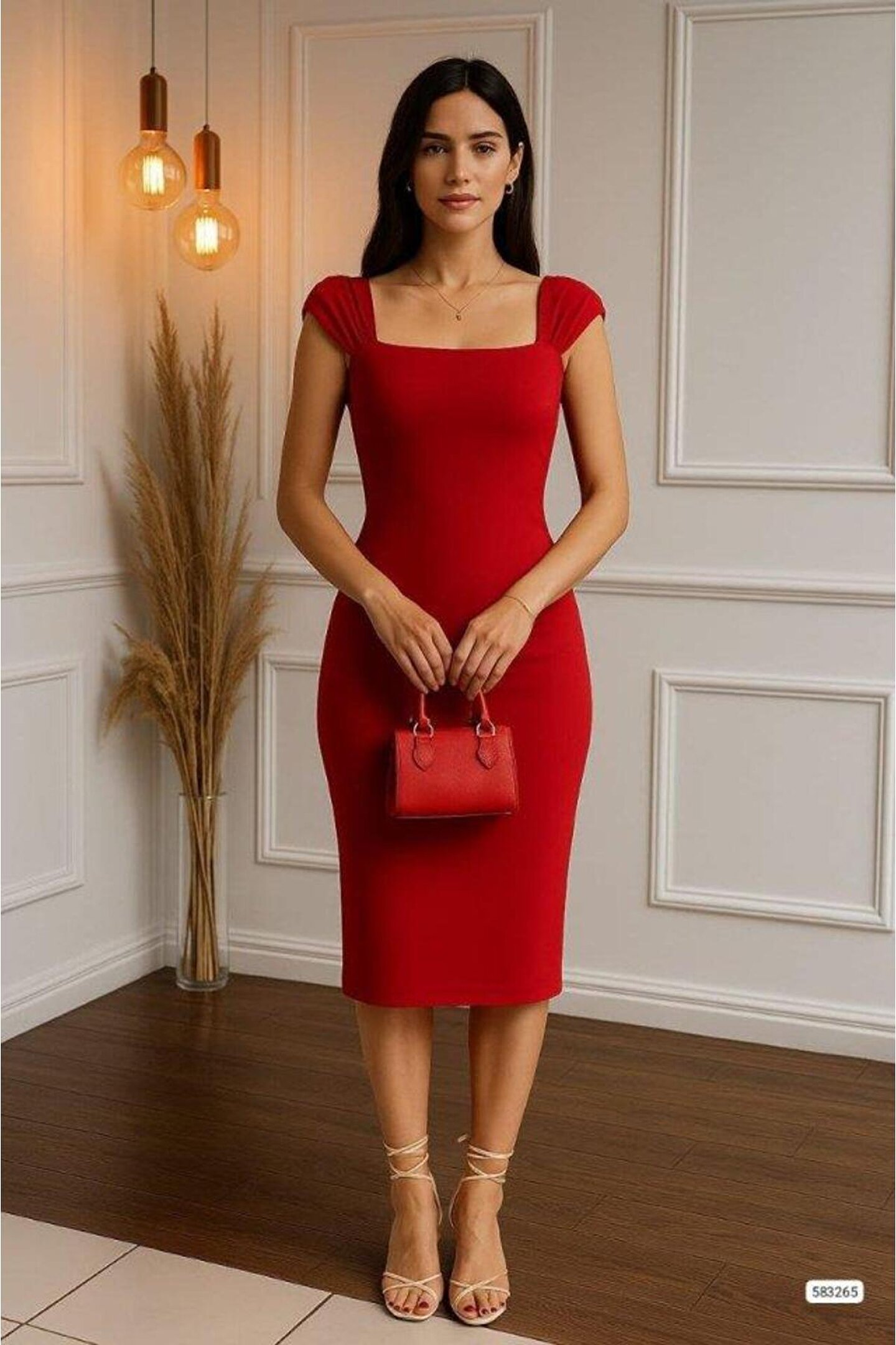 JARDİN ALLURE Kadın Omuz Askılı Kare Yaka Detay Midi Boy Kalem Elbise