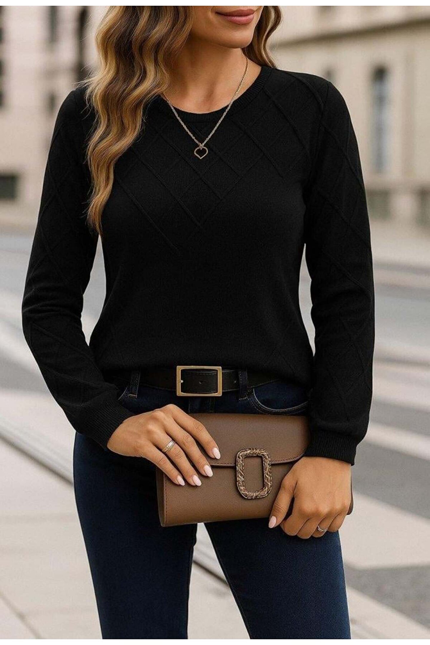 Kadın Uzun Kollu Bisiklet Yaka Geometrik Desenli Triko Bluz
