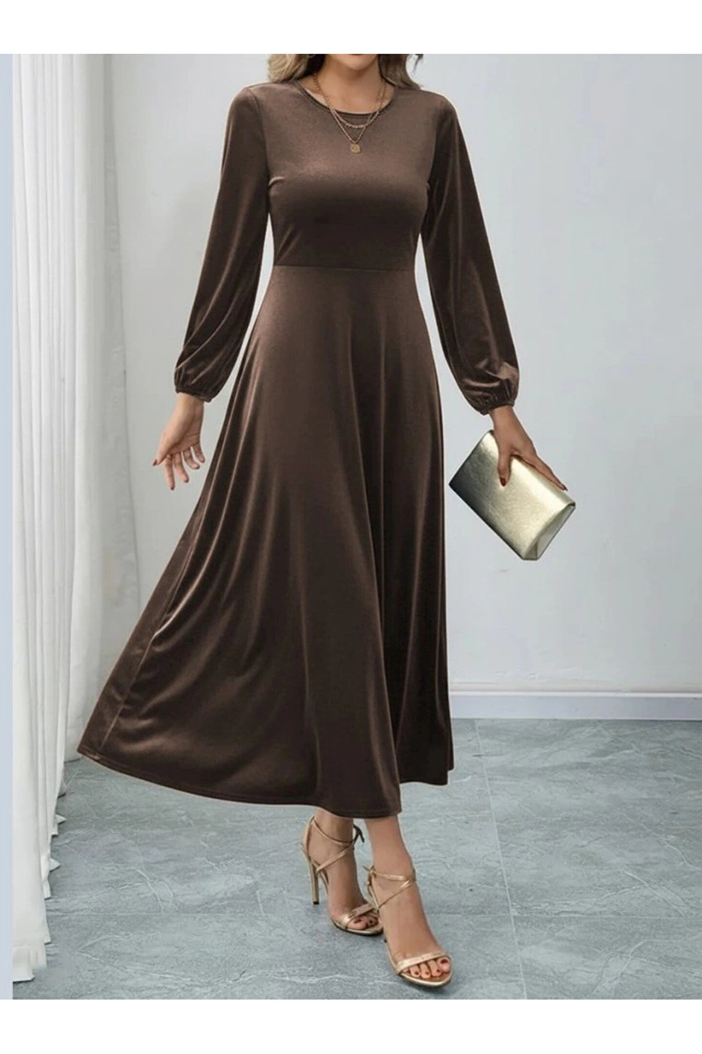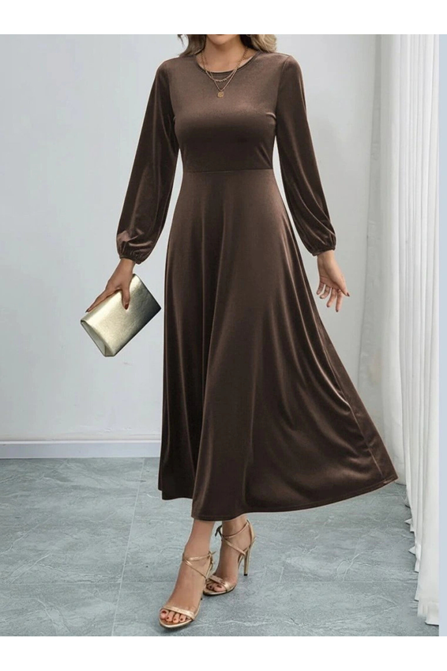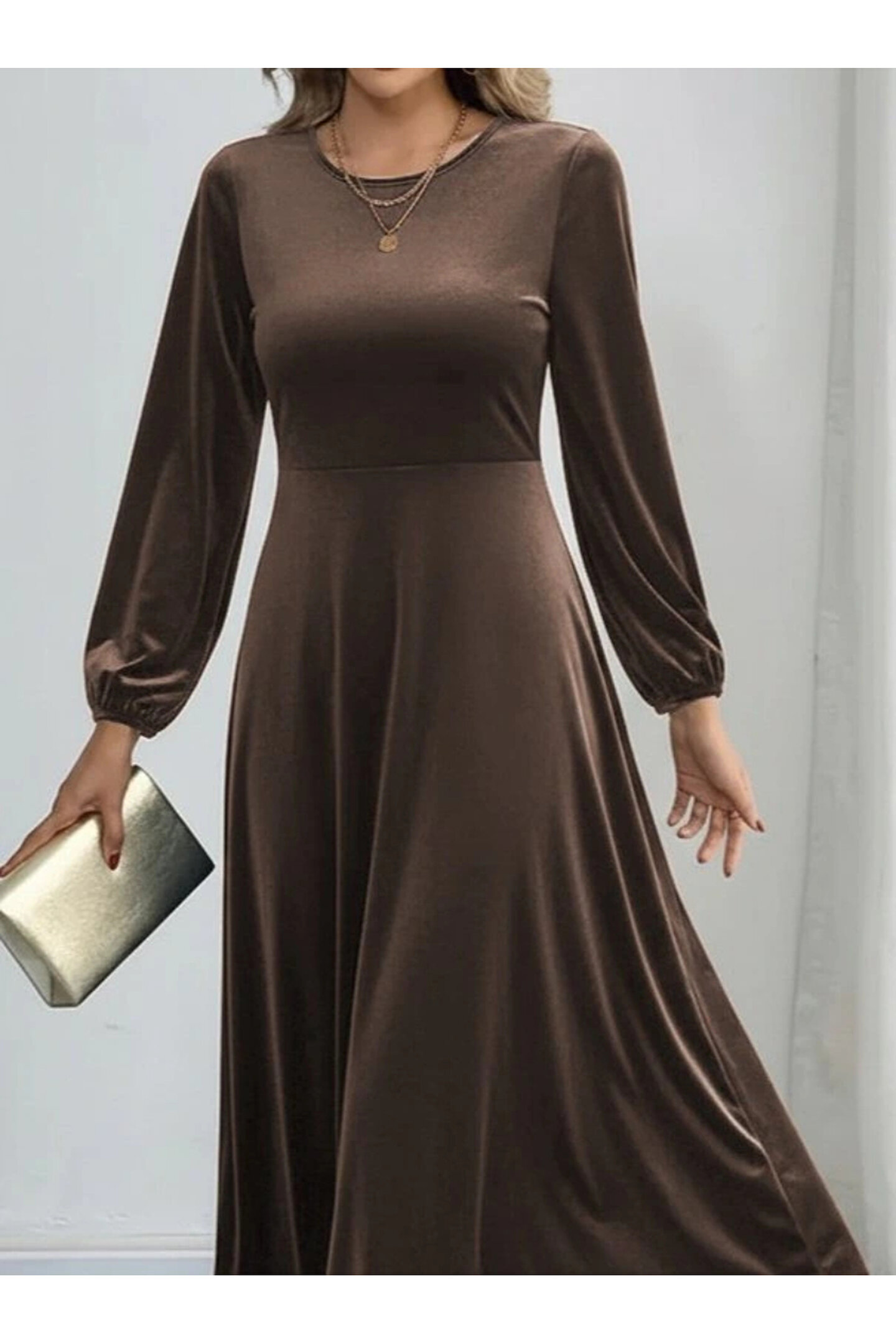 Kadın Uzun Kollu Bisiklet Yaka Midi Kadife Elbise