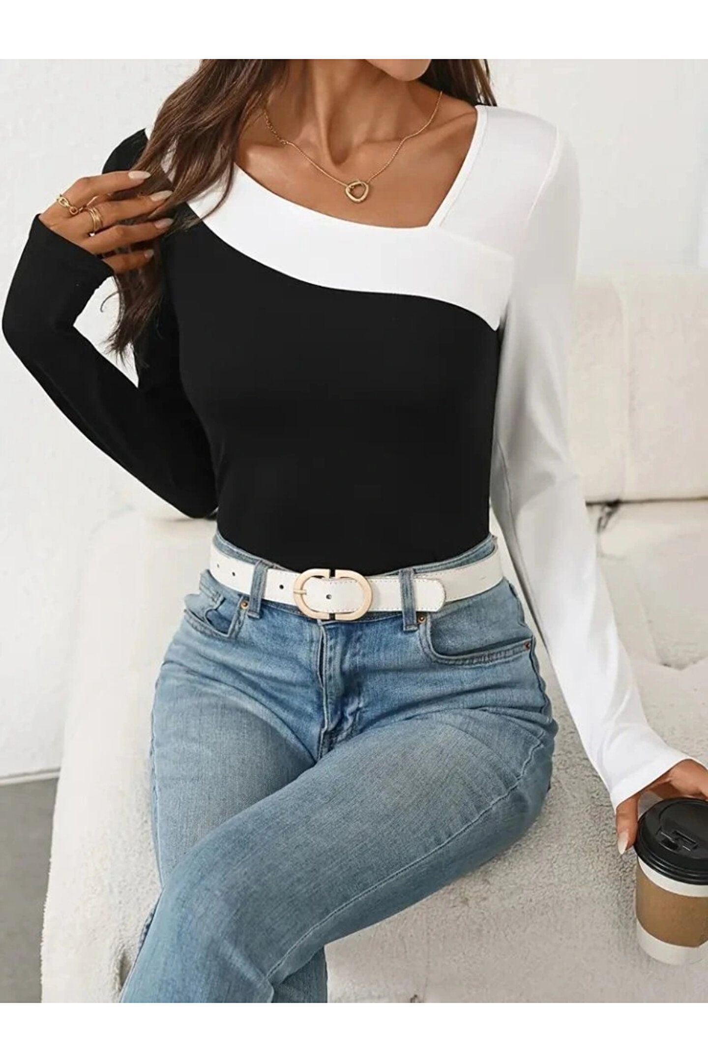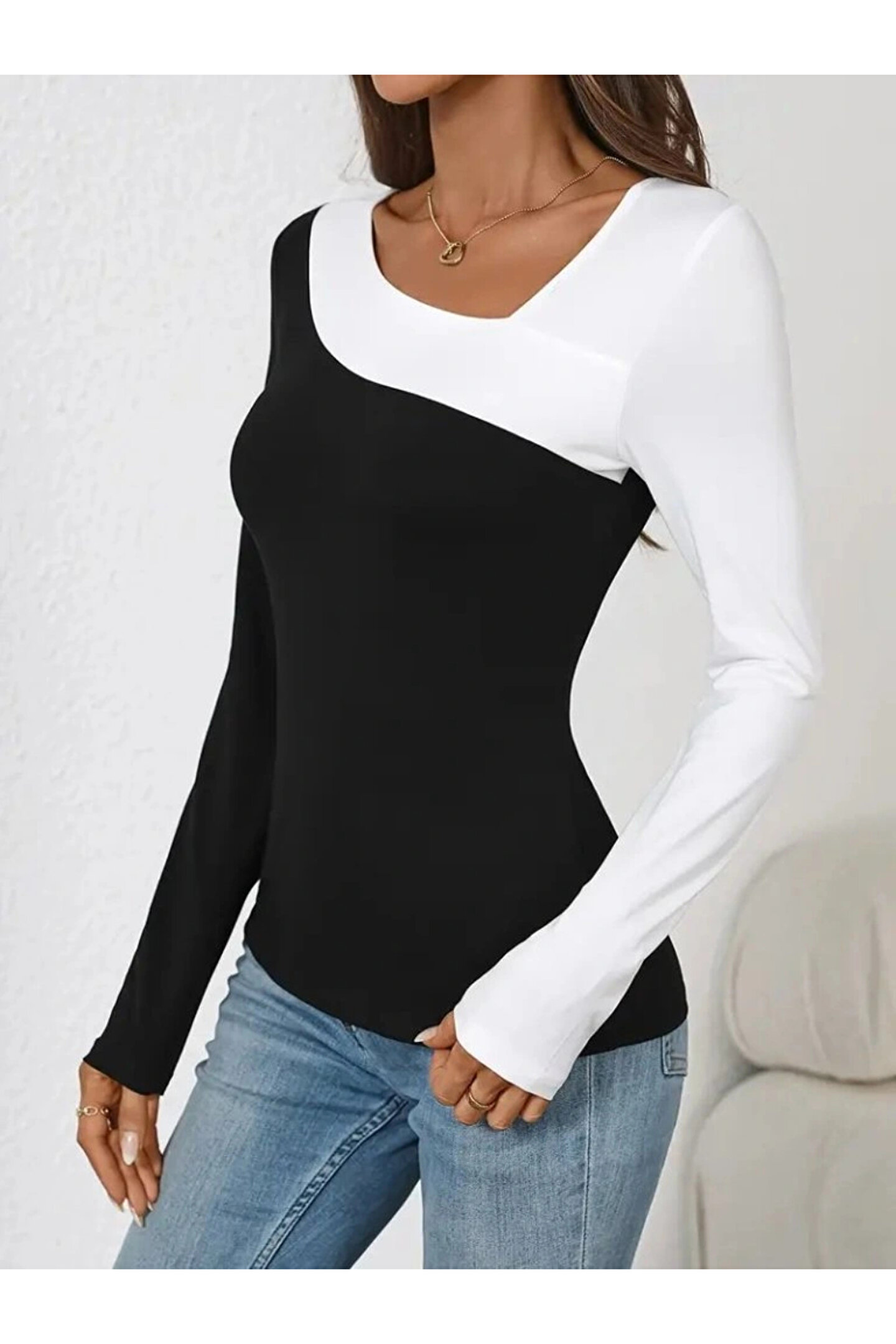 Kadın Uzun Kollu Geometrik Yaka Detaylı çift Renkli Viskon Bluz