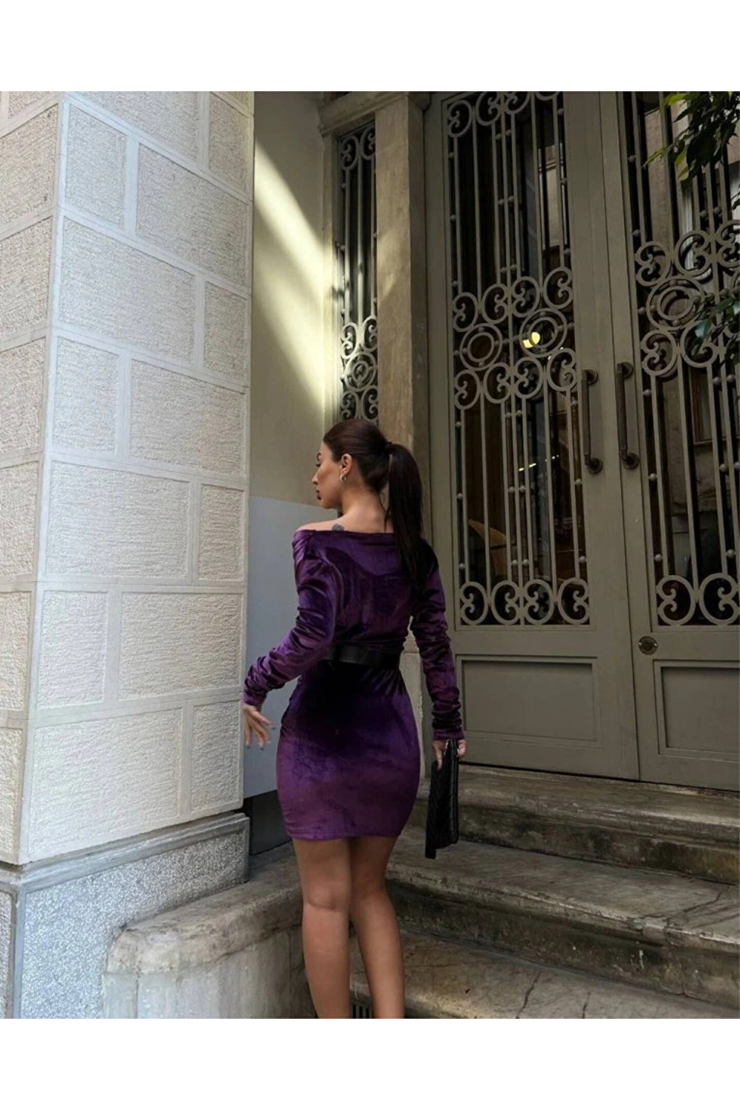 Kadın Uzun Kollu Kruvaze Yaka Omuz Dekolteli Kemer Dahil Mini Kadife Elbise