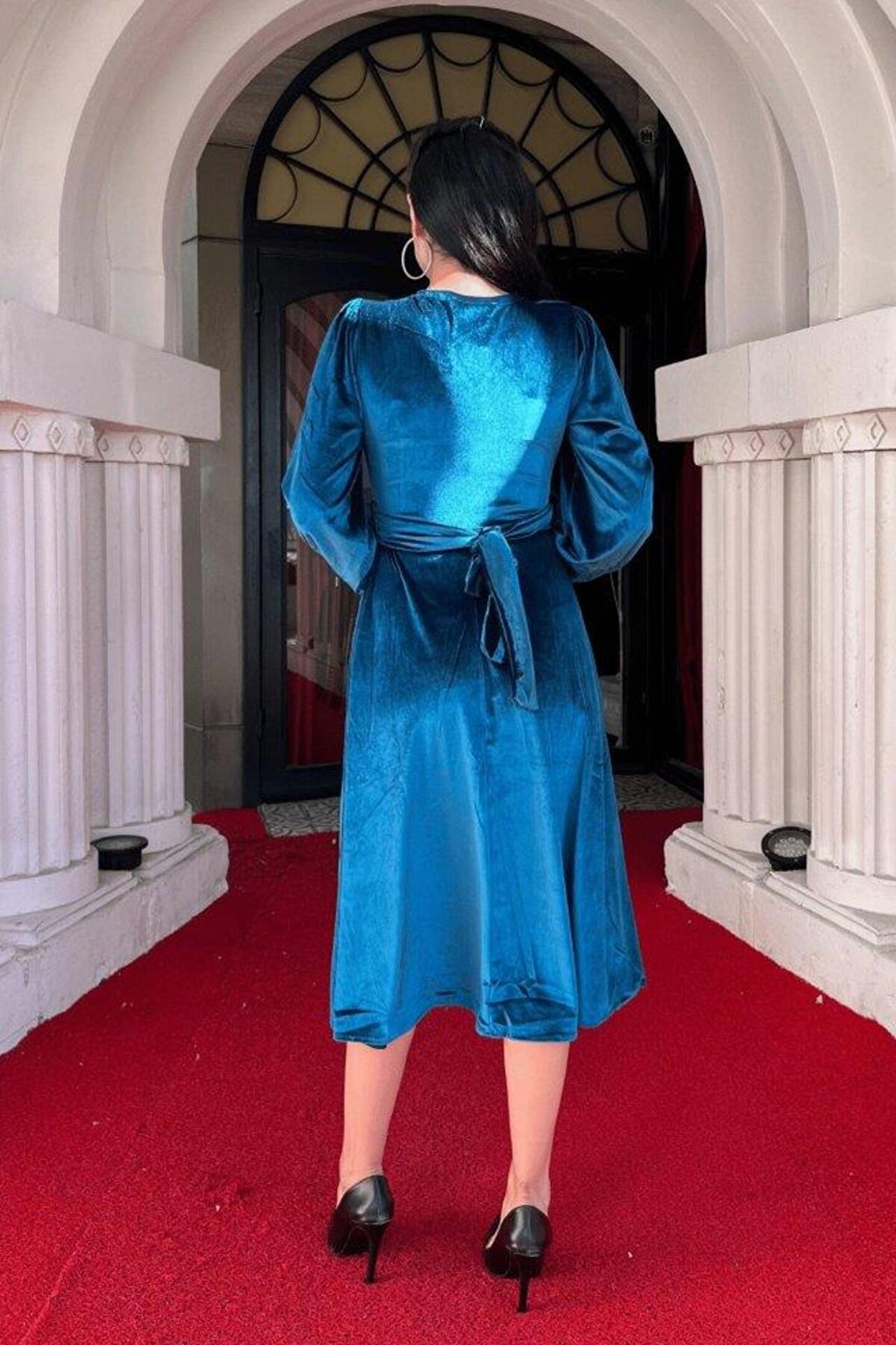 Kadın Uzun Kollu V Yaka Kuşak Dahil Kadife Kumaş Midi Boy Elbise