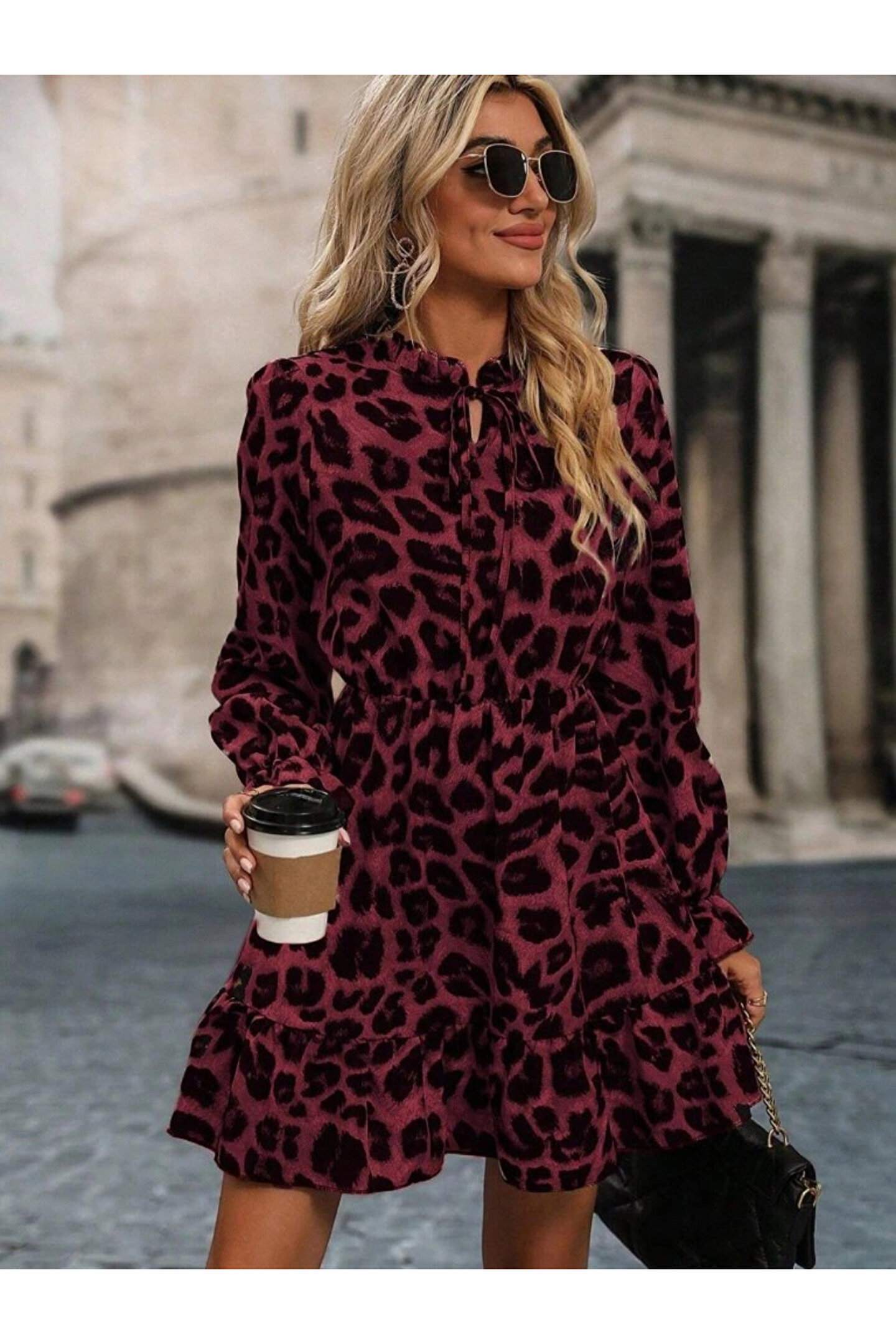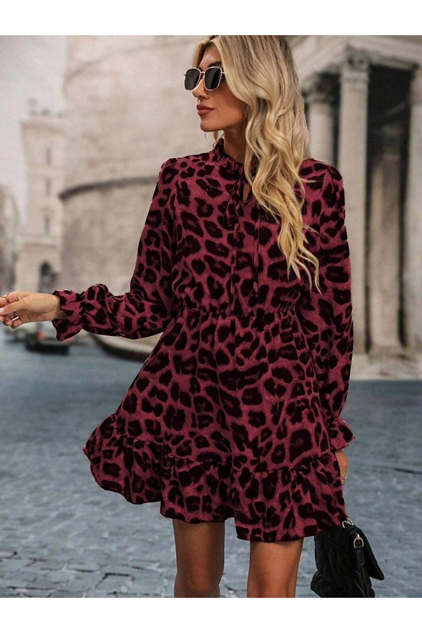 Kadın Uzun Kollu Yakadan Bağcıklı Modal Leopar Desenli Mini Elbise Stok Kodu: 174317