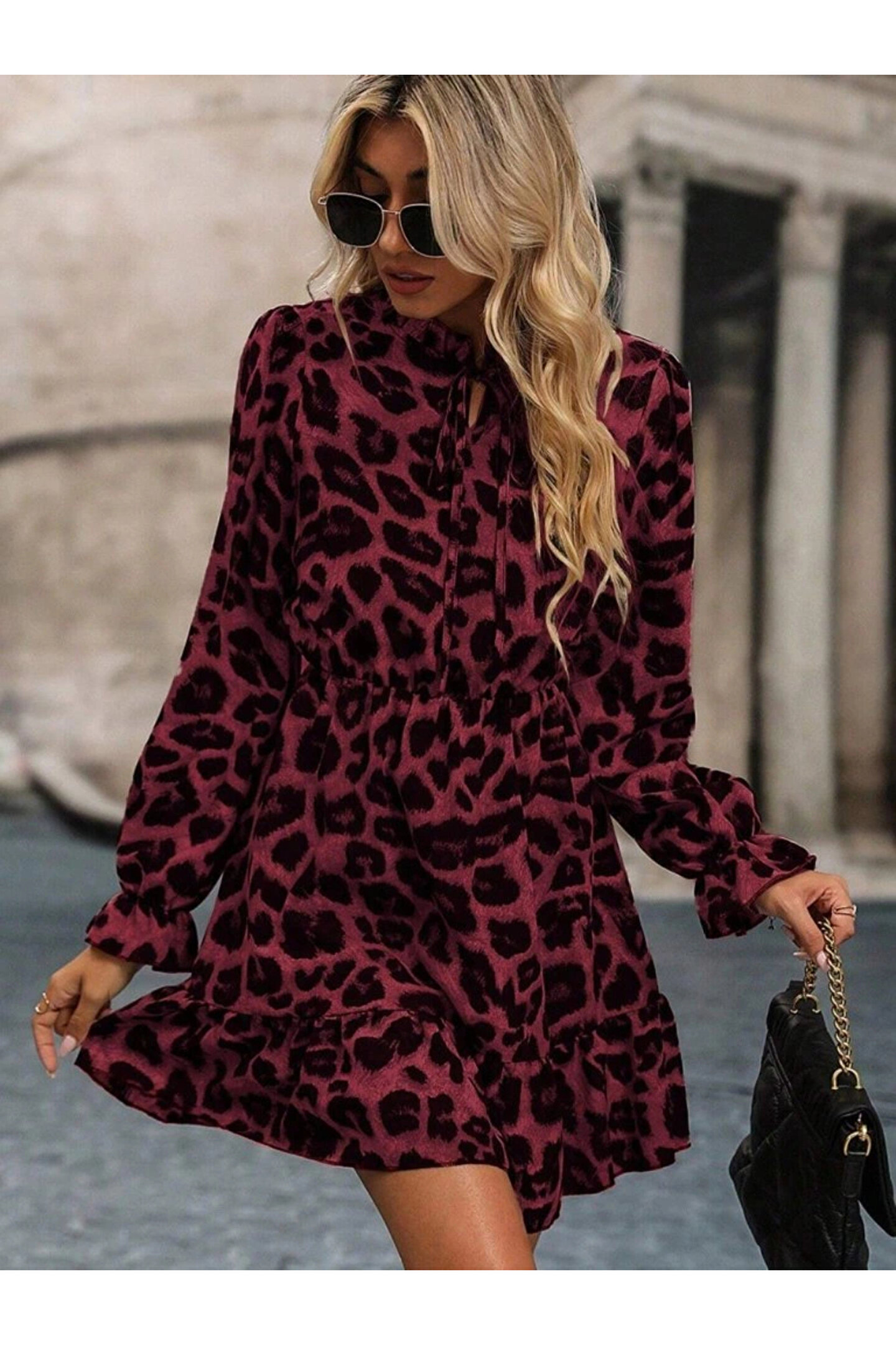 Kadın Uzun Kollu Yakadan Bağcıklı Modal Leopar Desenli Mini Elbise Stok Kodu: 174317