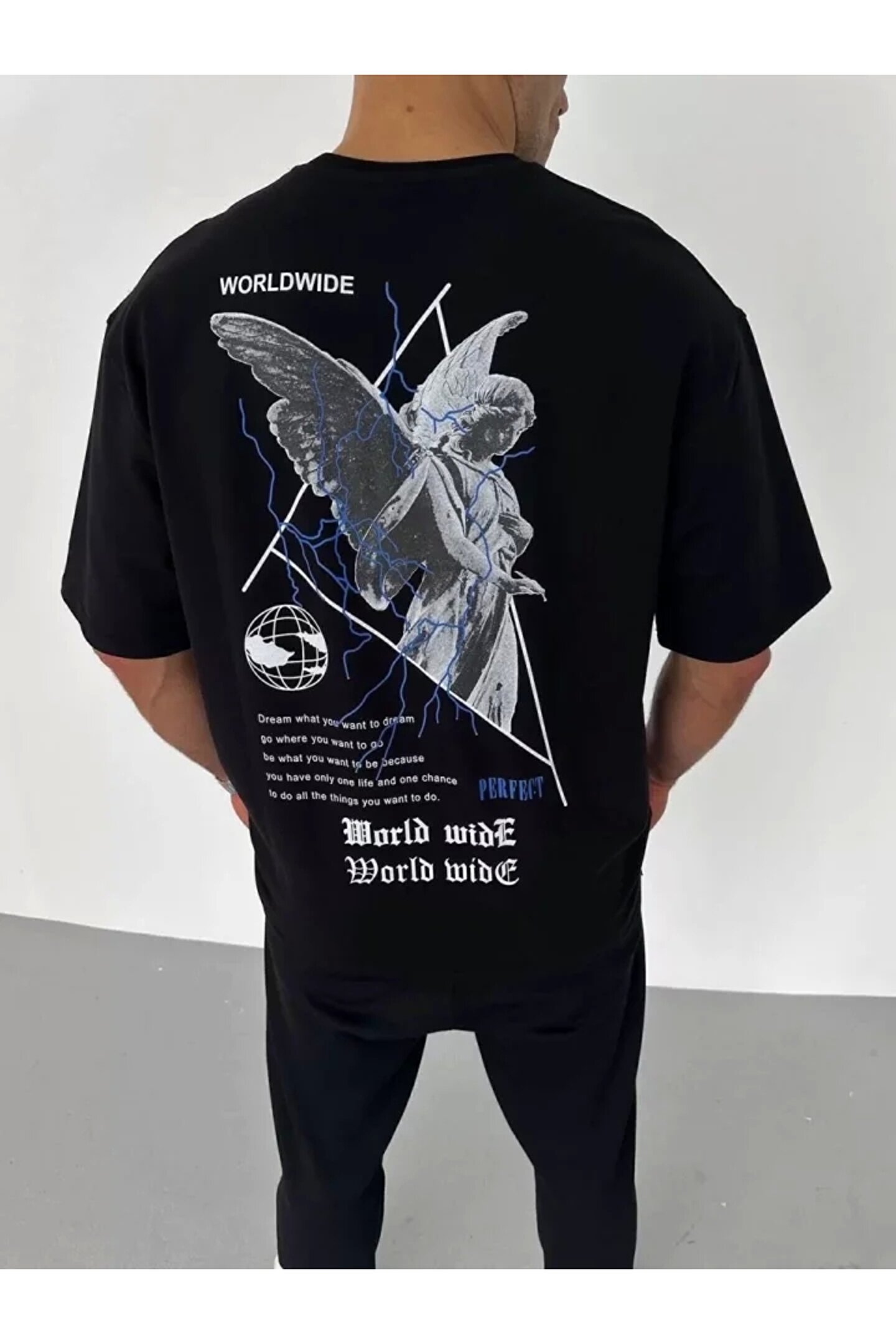Unisex Bisiklet Yaka Baskılı Oversize T-Shirt - Siyah