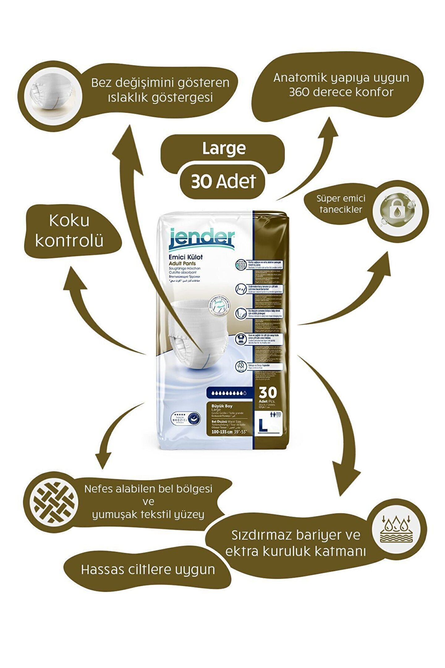 Emicilik Seviyesi : Orta Emici İdeal koruma ve kuruluk seviyesi için benzersiz çift katlı emici bölge. ; Nefes alan iç ve dış tekstil yüzeyi sayesinde cildi tahriş ve enfeksiyonlara karşı korur. ; Ek koruma sağlayan sızdırmaz bariyerler. ; Koku nötrleştirici özelliği sayesinde amonyağın istenmeyen koku etkisini azaltır. ; Vücuda tam oturan anatomik kesimi sayesinde vücudu kusursuz olarak sarar ve maksimum konfor sağlar. ; Kolay çıkartmak için yırtılabilir yan dikişler. ; Kolay atılabilmesi için katlanabilir özellik. ; Anatomik tasarımı sayesinde Emici Külotu günlük iç çamaşırı olarak kullanabilirsiniz. ; Defalarca açılıp kapanabilen cırt bantları sayesinde bezinizi gün içerisinde sık sık kontrol edebilirsiniz. ; Islaklık göstergesi, renk değiştirerek bezin değişim zamanını takip etmenize yardımcı olur. ; Özel anatomik tasarımı sayesinde vücudu kusursuz olarak sararak yüksek konfor sağlar.;