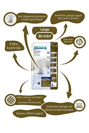 Beden : L Beden Bel Çevresi : Large (110; 150 cm) Adet : 30 Emicilik Seviyesi : Hafif; Orta Emici İdeal koruma ve kuruluk seviyesi için benzersiz çift katlı emici bölge; Nefes alan iç ve dış tekstil yüzeyi sayesinde cildi tahriş ve enfeksiyonlara karşı korur; Ek koruma sağlayam sızdırmaz bariyerler; Koku nötrleştirici özelliği sayesinde amonyağın istenmeyen koku etkisini azaltır; Vücuda tam oturan anatomik kesimi sayesinde vücudu kusursuz olarak sarar ve maksimum konfor sağlar; Kolay çıkartmak için yırtılabilir yan dikişler; Kolay atılabilmesi için katlanabilir özellik; Anatomik tasarımı sayesinde Emici Külotu günlük iç çamaşırı olarak kullanabilirsiniz; Defalarca açılıp kapanabilen cırt bantları sayesinde bezinizi gün içerisinde sık sık kontrol edebilirsiniz; Islaklık göstergesi, renk değiştirerek bezin değişim zamanını takip etmenize yardımcı olur; Özel anatomik tasarımı sayesinde vücudu kusursuz olarak sararak yüksek konfor sağlar; ;;