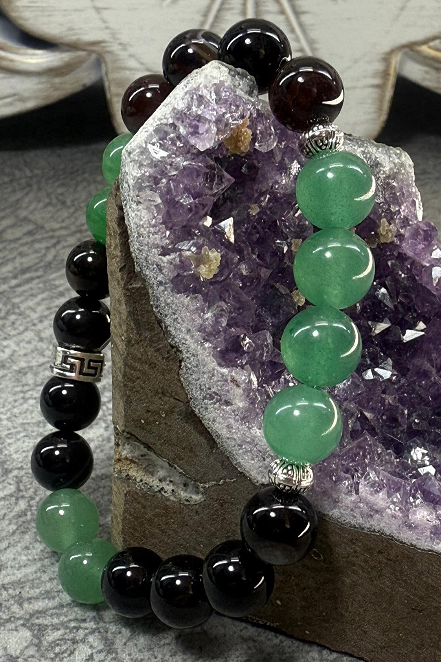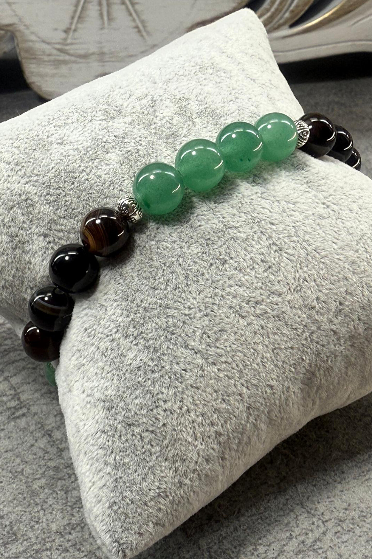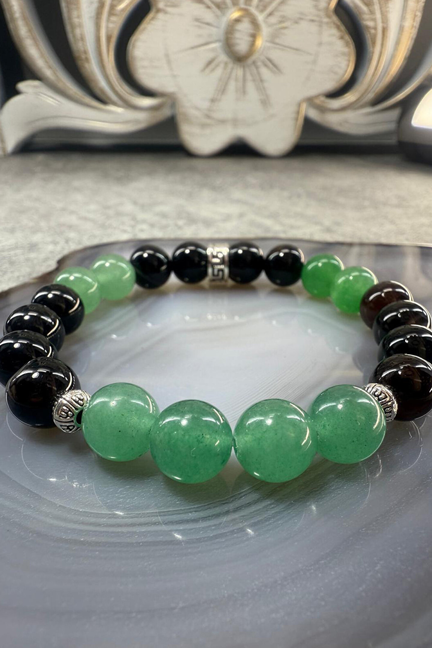 Bolluk-Bereket Bilekliği-%100 doğaltaş(Aventurin-GözAkik)-Doğal Taş Bileklik ; Şans ve Korumanın Eşsiz Uyumu: Aventurin & Göz Akik Doğal Taş Bileklik Doğanın kalbinden gelen iki güçlü taşı bir araya getirdik: Aventurin'in pozitif enerjisi ve Göz Akik'in koruyucu kalkanı! Bu özel tasarım bileklik, sadece şıklığınızı tamamlamakla kalmayacak, aynı zamanda ruhunuza ve enerjinize de iyi gelecek.; Her bir taşı özenle seçilmiş, el yapımı bu bileklikle stilinize anlam katın.; Aventurin Taşı'nın Enerjisi: ; Yeşil aventurin, "şans taşı" olarak bilinir ve hayatınıza bolluk, bereket, neşe ve pozitif enerji getirdiğine inanılır.; Kalp çakrasıyla uyumlu çalışarak duygusal dengeyi destekler, stresi azaltır ve iç huzuru artırmaya yardımcı olur.; Yeni başlangıçlar ve fırsatlar için size ilham versin! Göz Akik Taşı'nın Gücü: ; Göz akik, güçlü koruyucu özellikleriyle öne çıkar.; Nazara, kem göze ve negatif enerjilere karşı adeta bir kalkan görevi gördüğüne inanılır.; Cesaretinizi artırır, içsel gücünüzü ortaya çıkarır ve zihinsel odaklanmayı destekler.; Hayatın zorlukları karşısında size denge ve dayanıklılık katsın! Neden Bu Bileklik? ; Eşsiz Kombinasyon: Şans ve koruma enerjilerini bir arada sunar.; %100 Doğal Taş: Taşların saf ve doğal enerjilerinden faydalanın.; El Yapımı Zarafet: Her bir bileklik özenle, sevgiyle hazırlanmıştır.; Anlamlı Hediye: Kendiniz veya sevdikleriniz için hem şık hem de manevi değeri yüksek bir armağan.; Çok Yönlü Kullanım: Günlük kullanımda veya özel anlarda stilinizi tamamlar.; Aventurin bileklik Göz akik bileklik Doğal taş bileklik Aventurin taşı faydaları Göz akik taşı faydaları Şans bilekliği Koruma bilekliği Nazar bilekliği Yeşil doğal taş bileklik El yapımı bileklik Doğal taş takı Enerji bilekliği Şifalı taşlar bileklik Aventurin göz akik kombinasyonu Hediye doğal taş bileklik Kadın doğal taş bileklik