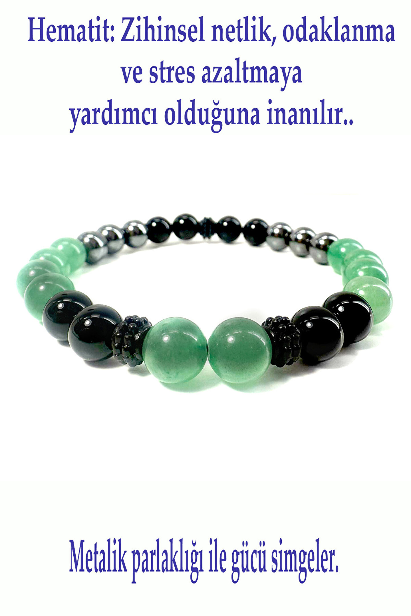 STRES BİLEKLİĞİ-%100 DOĞATAŞ BİLEKLİK-(ONİKS-AVENTURİN-HEMATİT BİLEKLİK) ; "Eşsiz bir enerji için Hematit, Aventurin ve Oniks doğal taş bilekliği.; Stresi azaltır, şansı çeker ve negatif enerjiden korur.; Ücretsiz kargo!" Hayatınıza denge, şans ve koruma katmak için özenle tasarladık! Hematit'in topraklayan gücü, Aventurin'in getirdiği şans ve bolluk, Oniks'in ise negatif enerjilere karşı kalkan oluşturan koruyucu etkisi bu eşsiz bileklikte bir araya geliyor.; Hematit: Zihinsel netlik, odaklanma ve stres azaltmaya yardımcı olduğuna inanılır.; Metalik parlaklığı ile gücü simgeler.; ; Aventurin: Fırsatların taşı olarak bilinir, kalbi yatıştırır ve pozitif enerjiyi çeker.; Yeşil tonlarıyla huzur verir.; ; Oniks: İçsel gücü, dayanıklılığı ve özgüveni artırdığına, negatif enerjilere karşı koruma sağladığına inanılır.; Asil siyah rengiyle zarafet katar.; ; Bu özel tasarım bileklik, hem günlük şıklığınızı tamamlayacak hem de size pozitif enerji, denge ve koruma sunacaktır.; Kendiniz için anlamlı bir hediye ya da sevdiklerinize enerjisi yüksek bir armağan arıyorsanız, bu bileklik tam size göre! Doğanın gücünü ve zarafetini bileğinizde taşıyın.; " Doğal taş bileklik-Enerji bilekliği- El yapımı bileklik-Kadın bileklik -Erkek bileklik-Unisex bileklik-Hediye bileklik-Özel tasarım bileklik ; Şans bilekliği Koruyucu bileklik Stres azaltan bileklik Pozitif enerji bilekliği Denge bilekliği Topraklama bilekliği Negatif enerji kalkanı bilekli