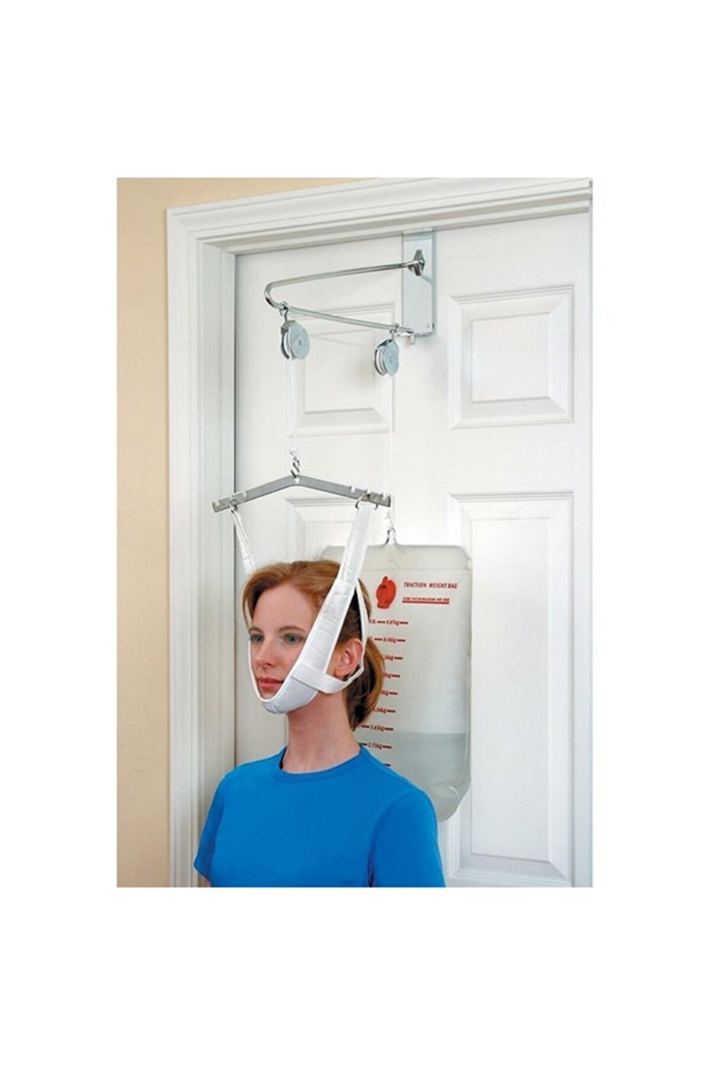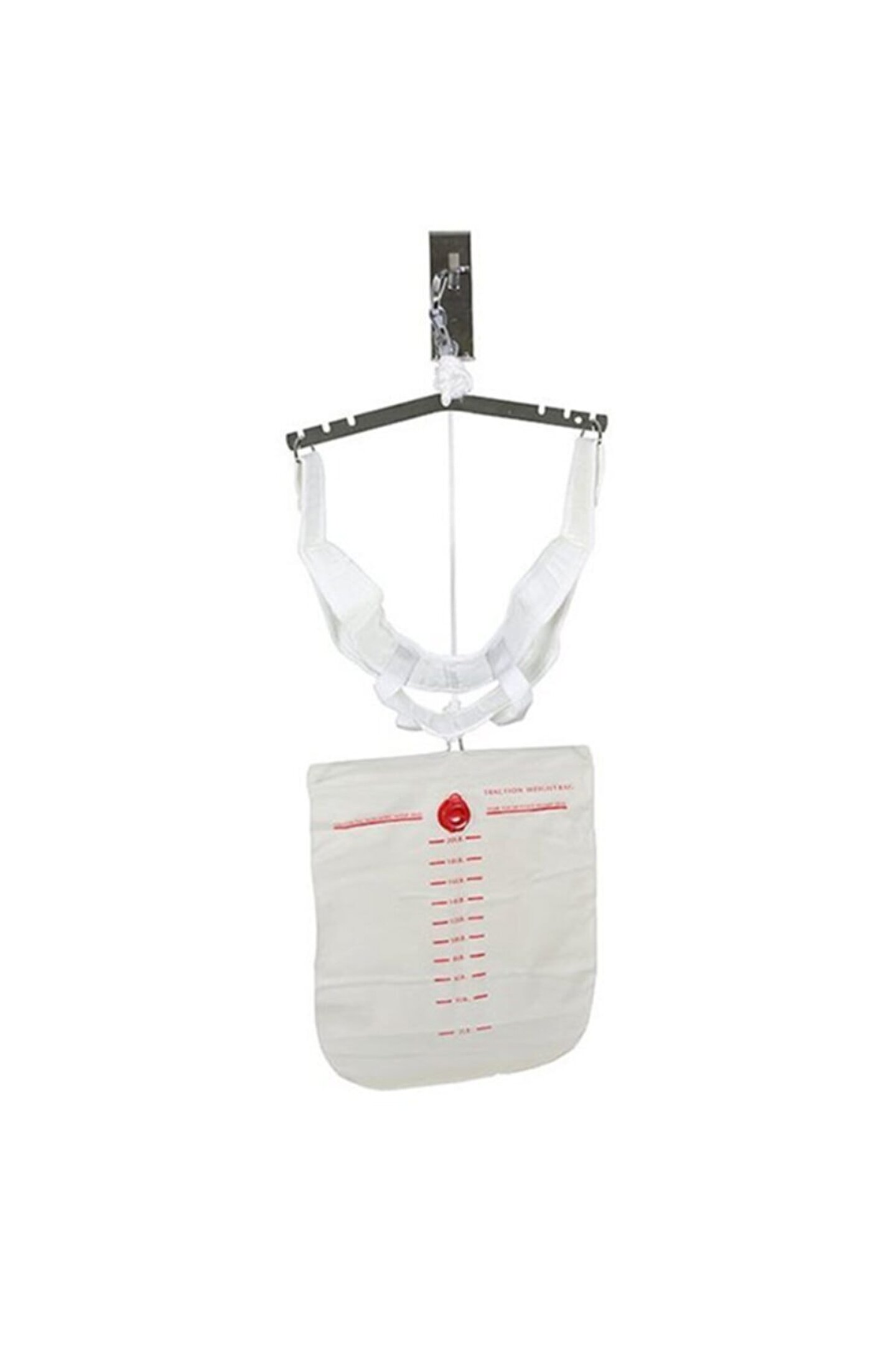 Evde servikal traksiyon yapmanın etkili ve ekonomik bir yolu. ; Servikal traksiyon kiti, gerekli gerilimi sağlayan değişken, su dolu bir ağırlık torbası kullanarak omurga üzerindeki basıncın hafifletilmesine yardımcı olabilir. ; Kasnaklar, çekiş halatı, çentikli ayarlanabilir ayırıcı çubuk, deluxe ayarlanabilir köpük halter, s-Kanca ve 20 lbs'ye kadar dereceli ölçekli vinil ağırlık torbası (su ekleyin).;