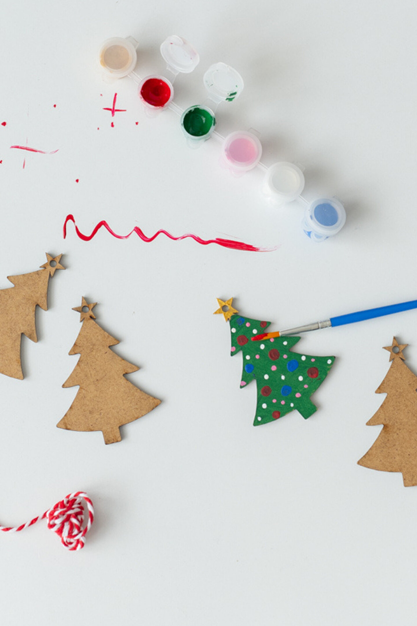 Set içeriği: 6 farklı renkte boya paleti, boya fırçası , 5 adet ahşap yılbaşı ağacı ,ip