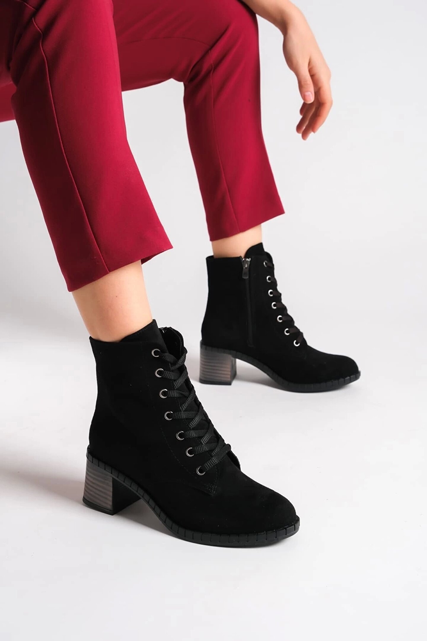 Joy Ayakkabı Dıana Bağcıklı Fermuarlı Ortopedik Taban Topuklu Süet Kadın Bot Sst - Siyah