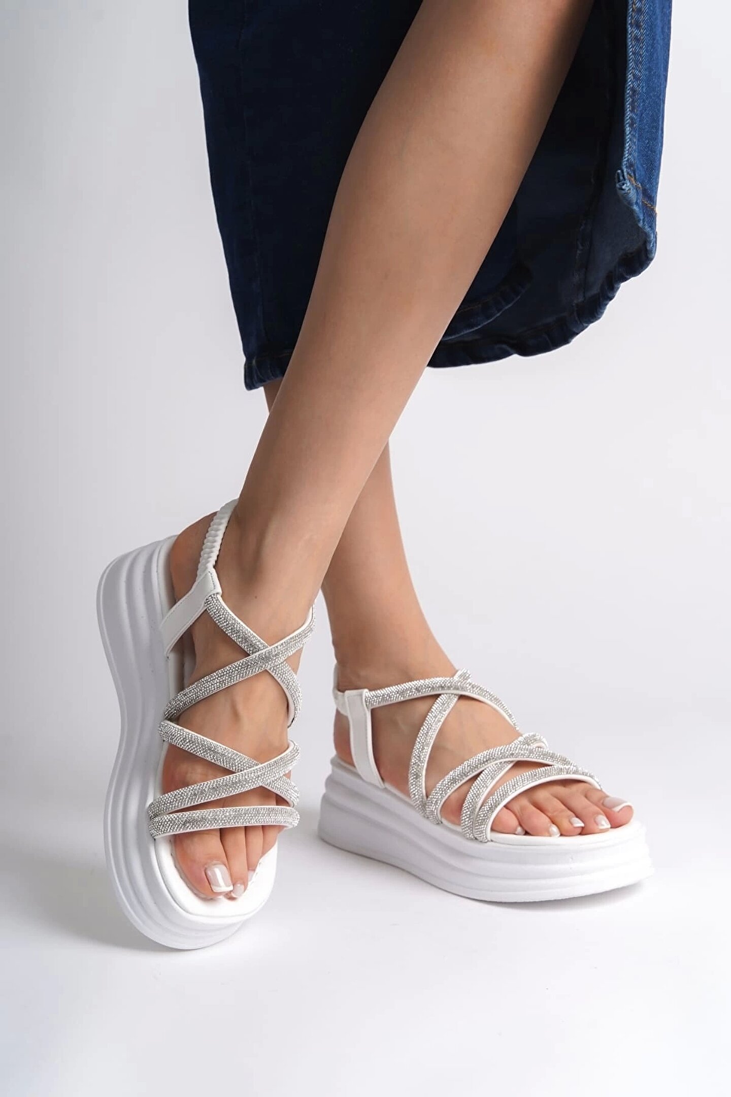 ELENA Lastikli Taşlı Şeritli Ortopedik Taban Kadın Sandalet CBT - Beyaz